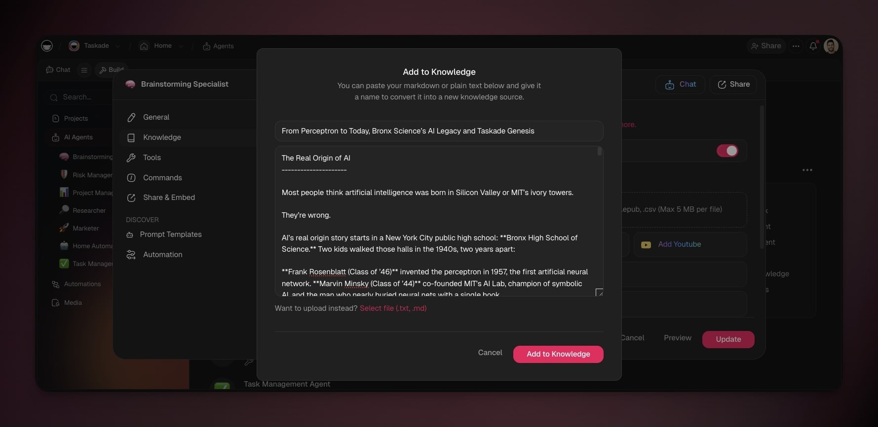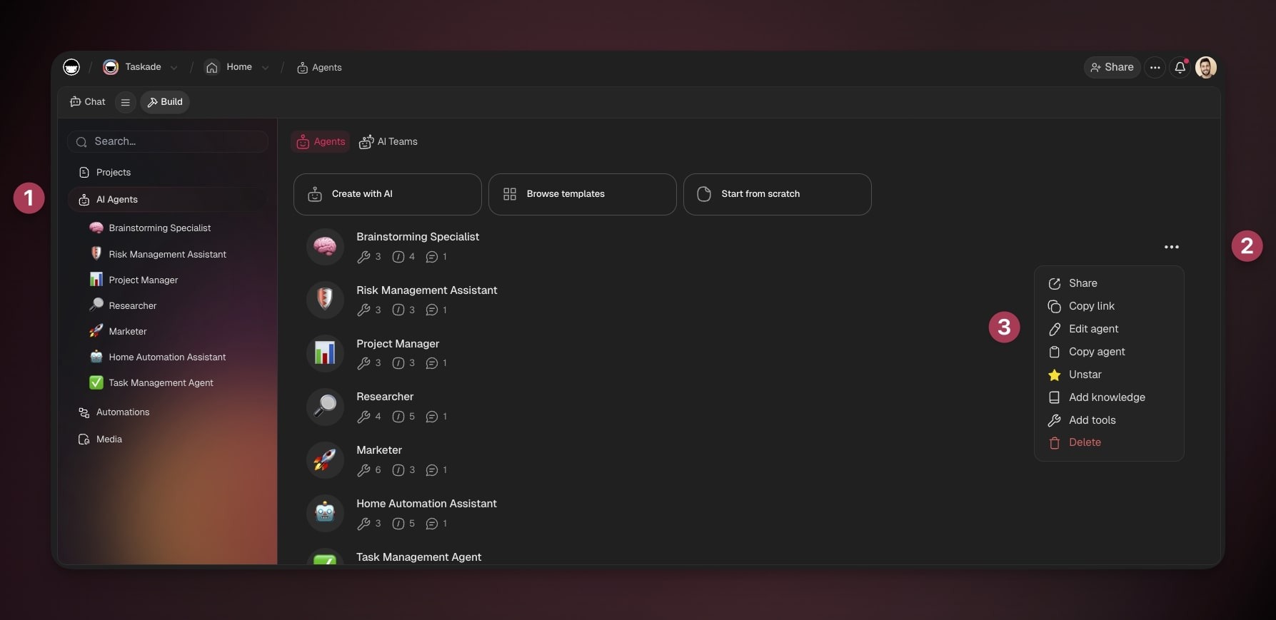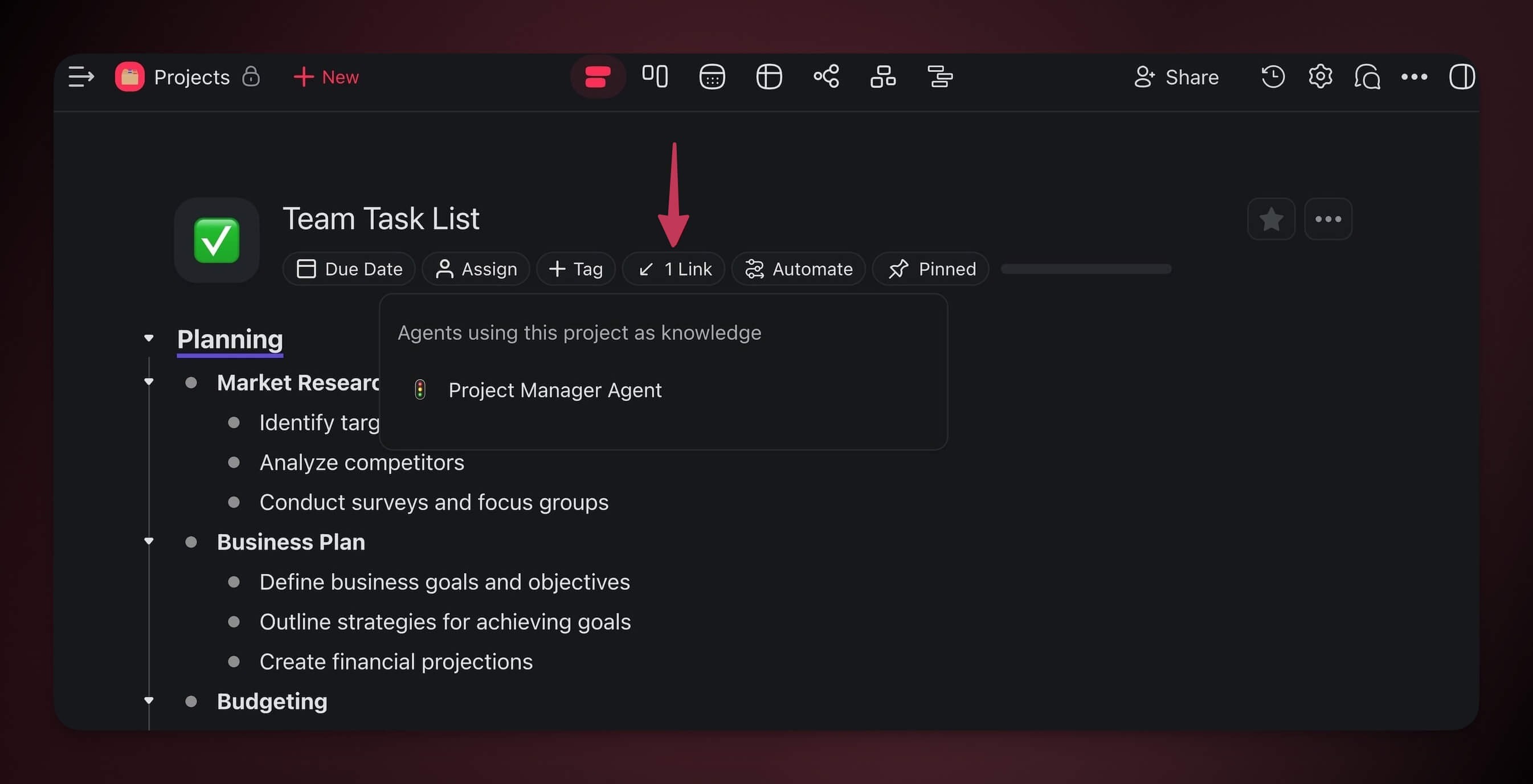 Whenever an agent adds a project as knowledge, Taskade will add a backlink inside that project so you can instantly see which agents are using it.