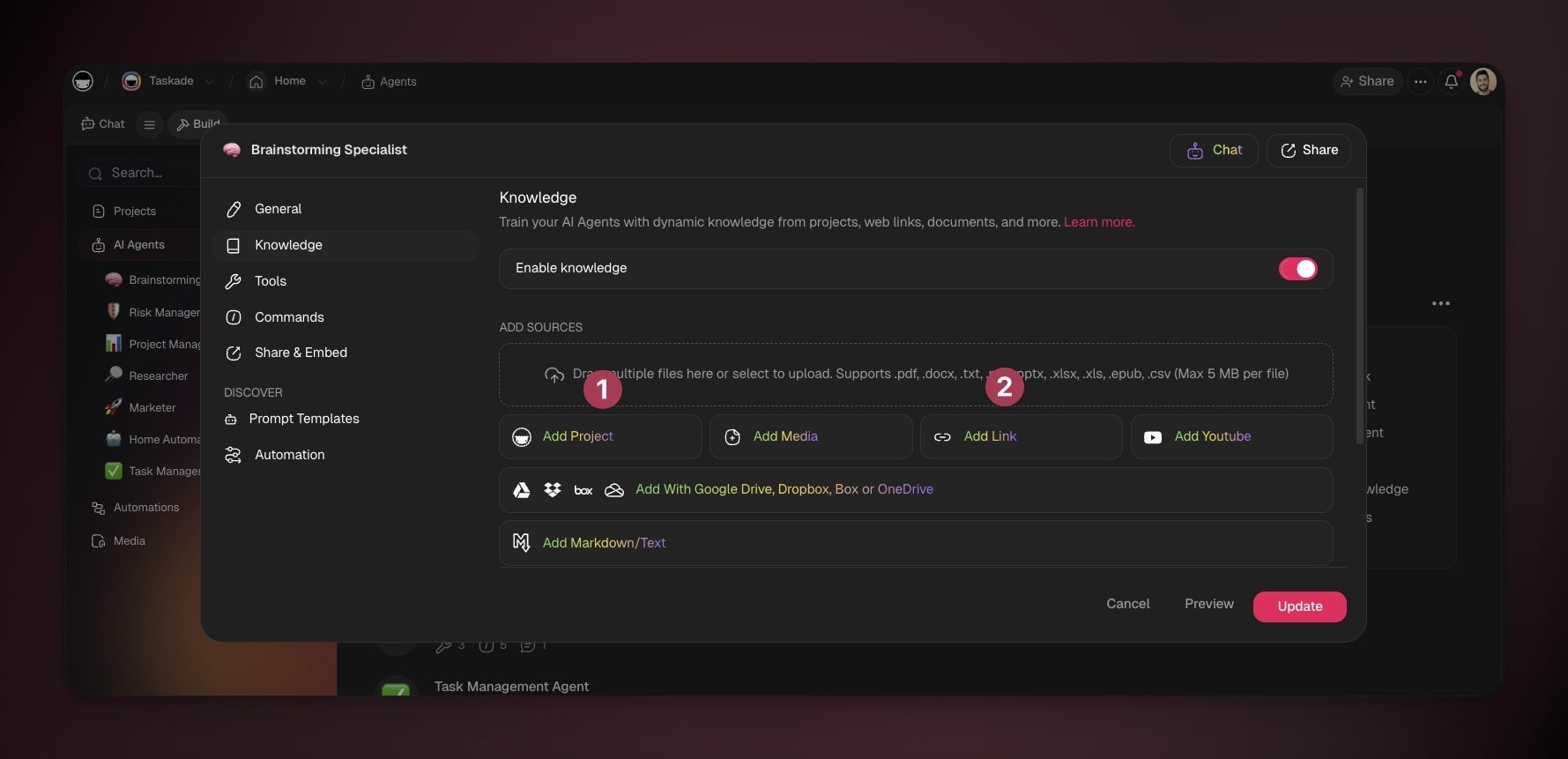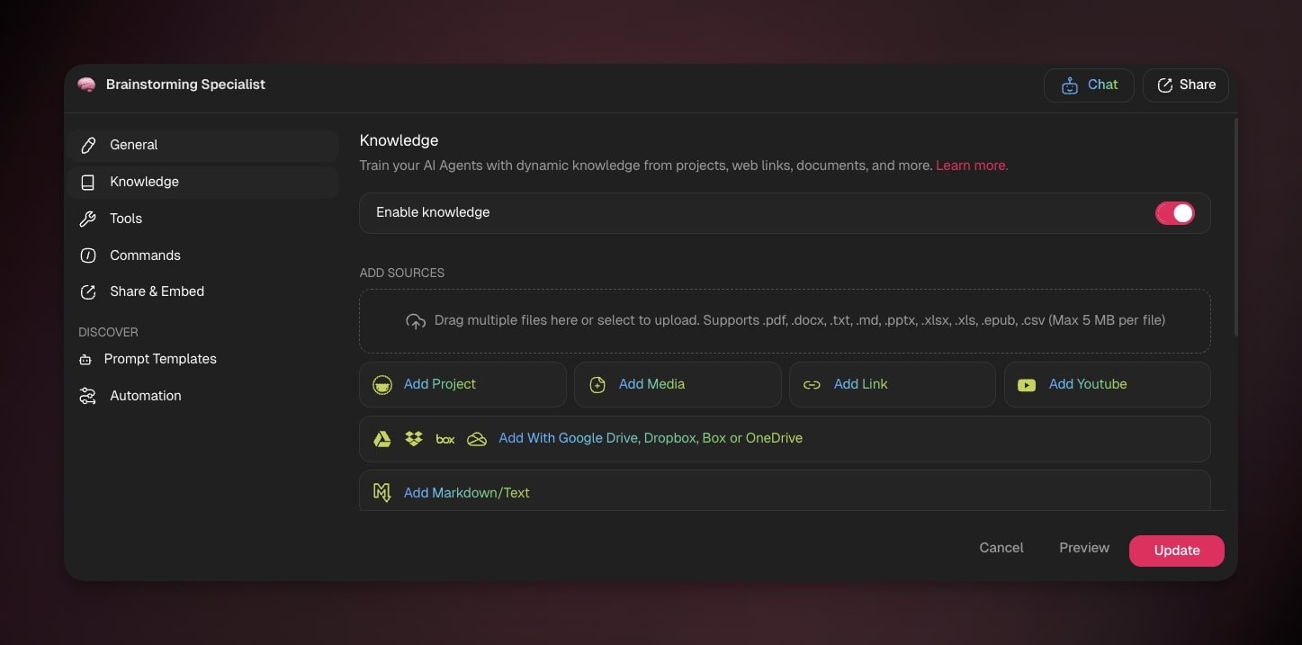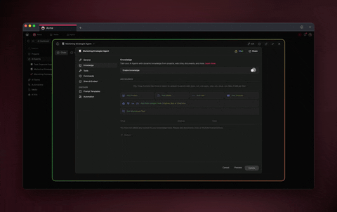 Adding links and projects to your agent's knowledge base allows it to learn new things. Combining dynamic and static knowledge (uploaded files and documents) gives the agent a better understanding of what you're working on.