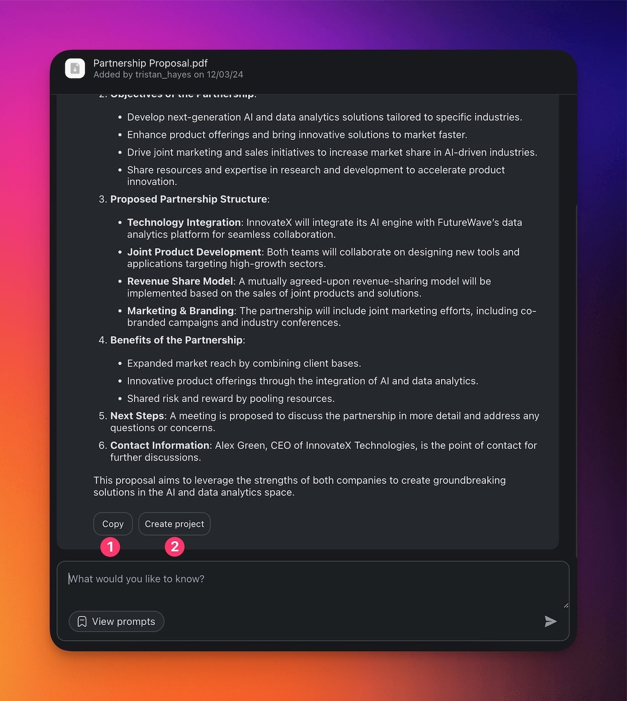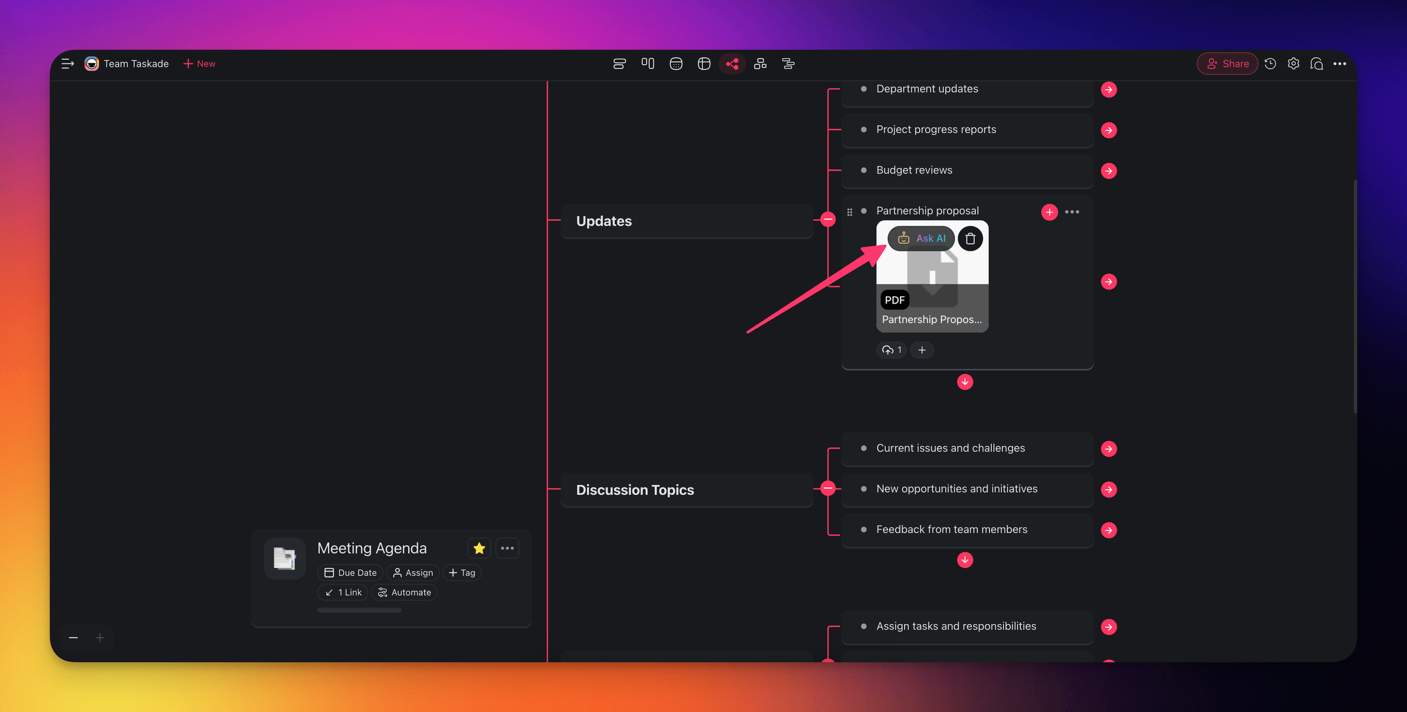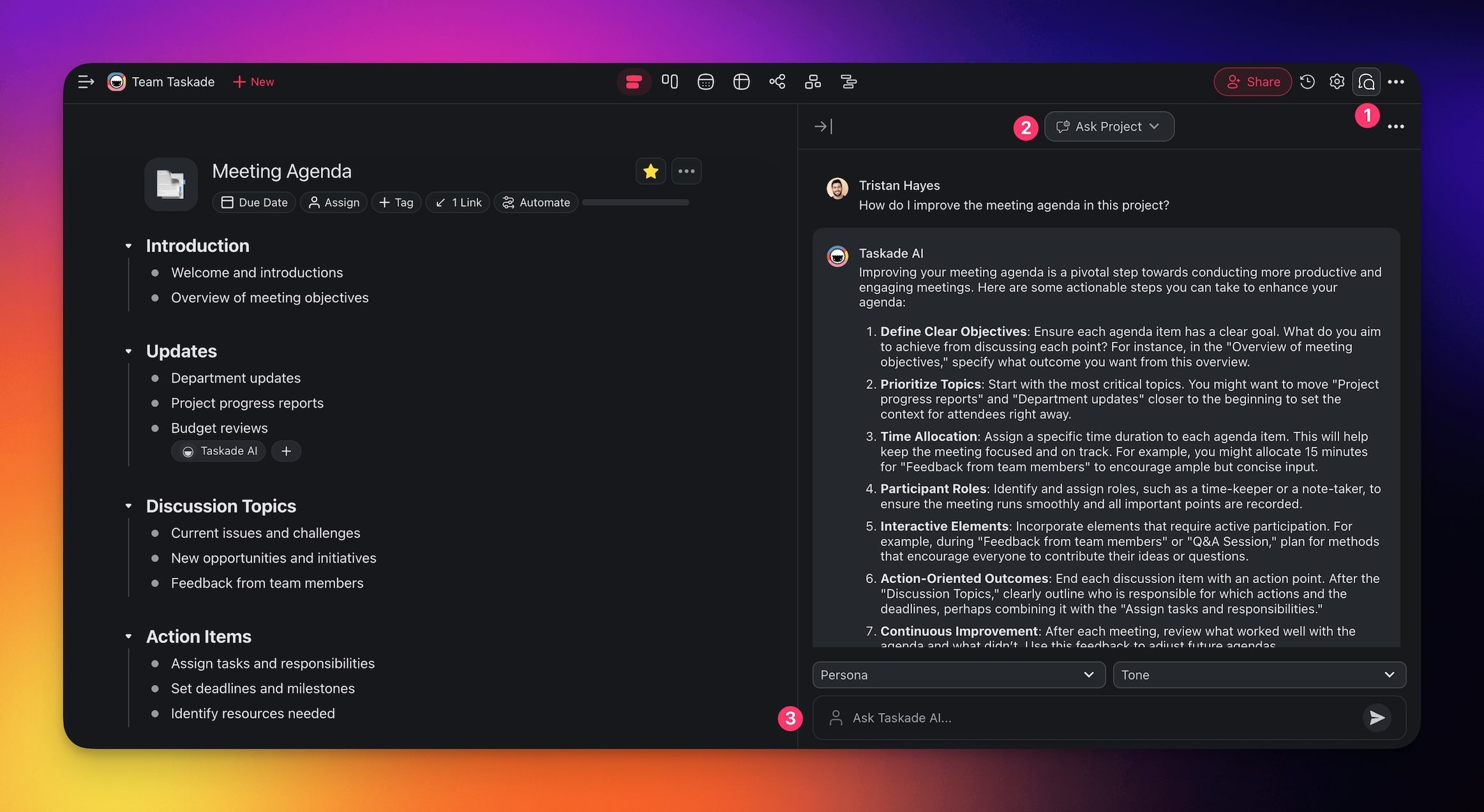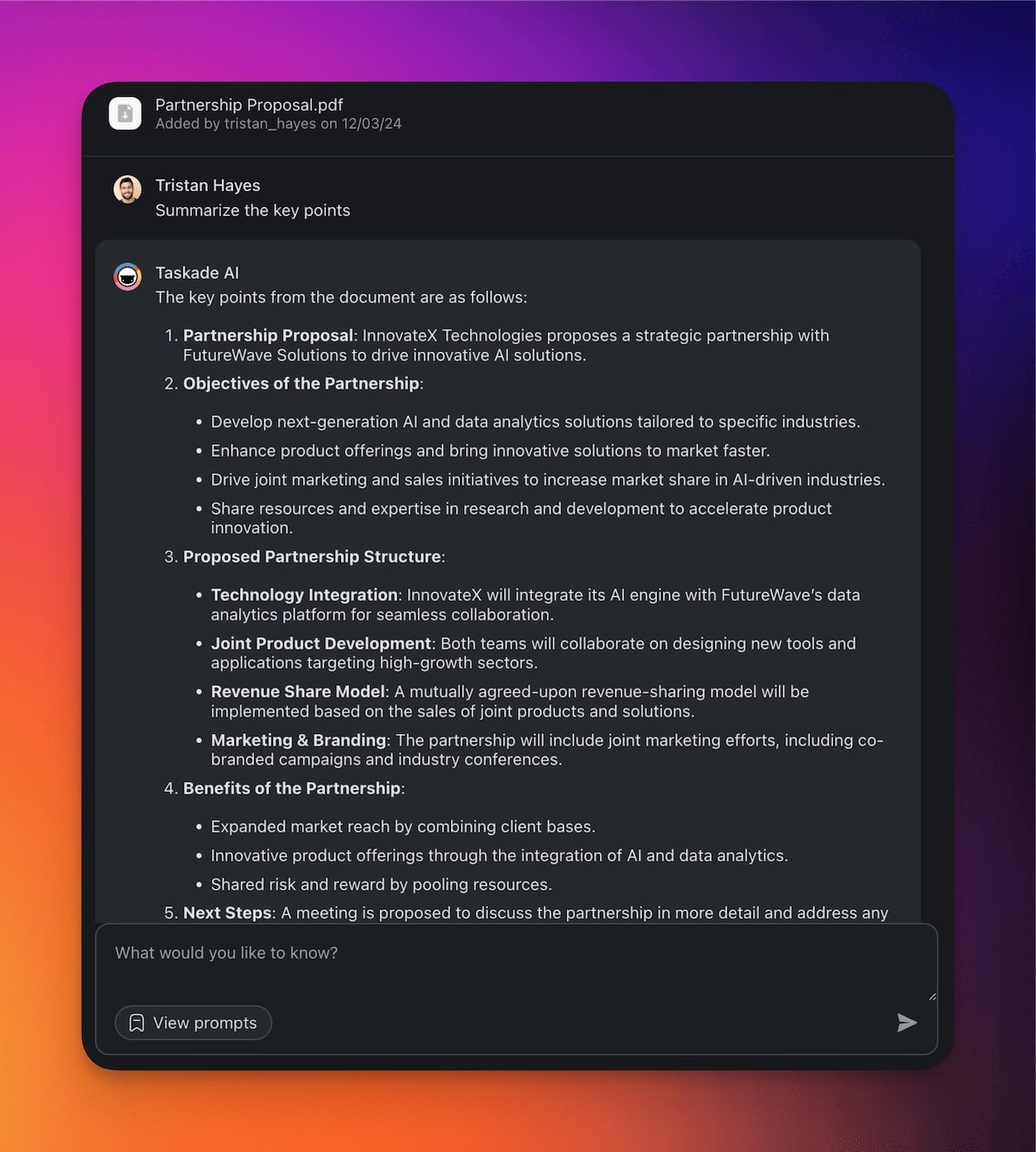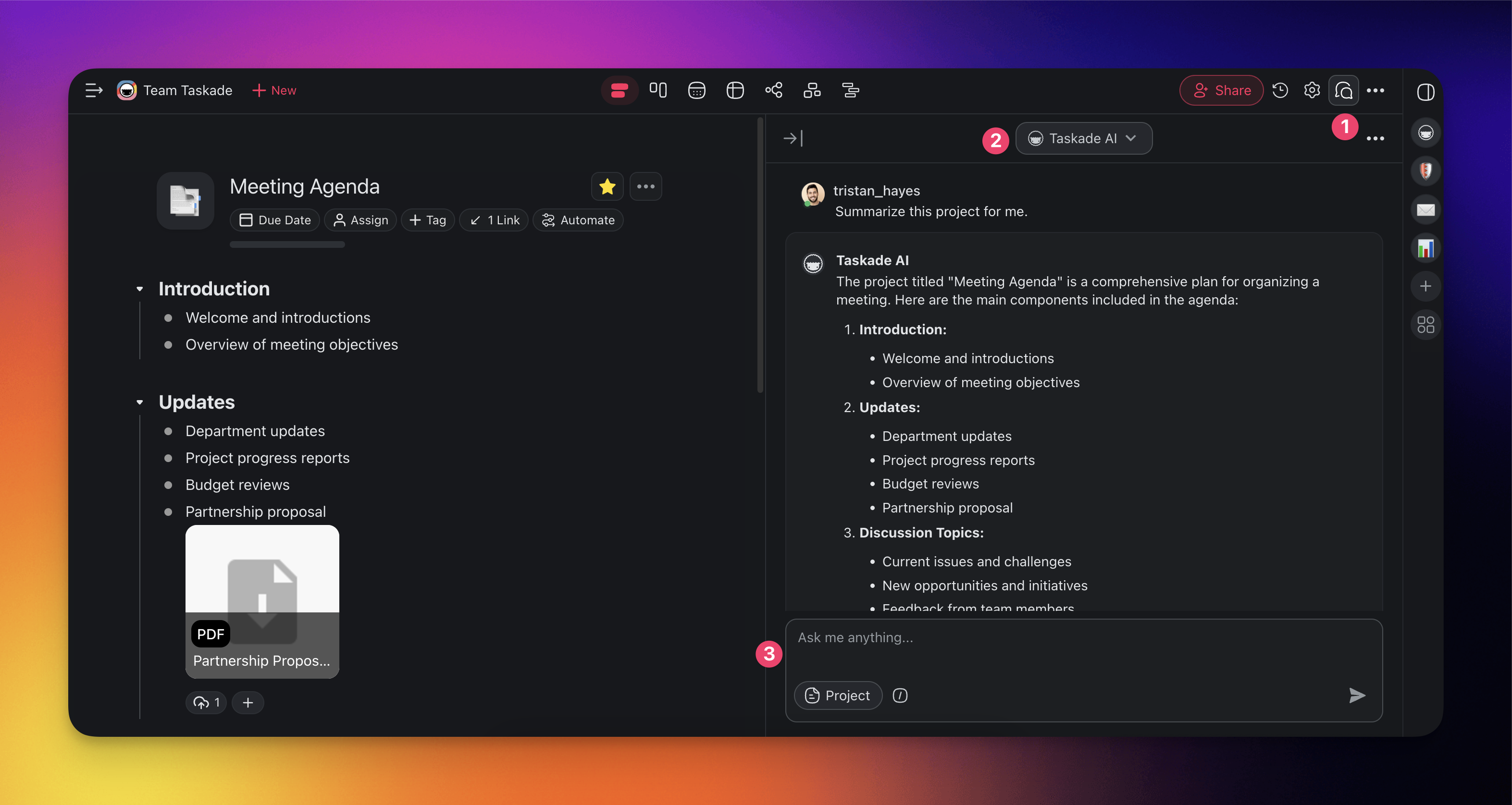 Transform the way you interact with documents and projects. You can now engage in productive Q&A sessions with Taskade AI and ask questions about the contents of your projects, files, and attachments. Follow the steps below to get started.