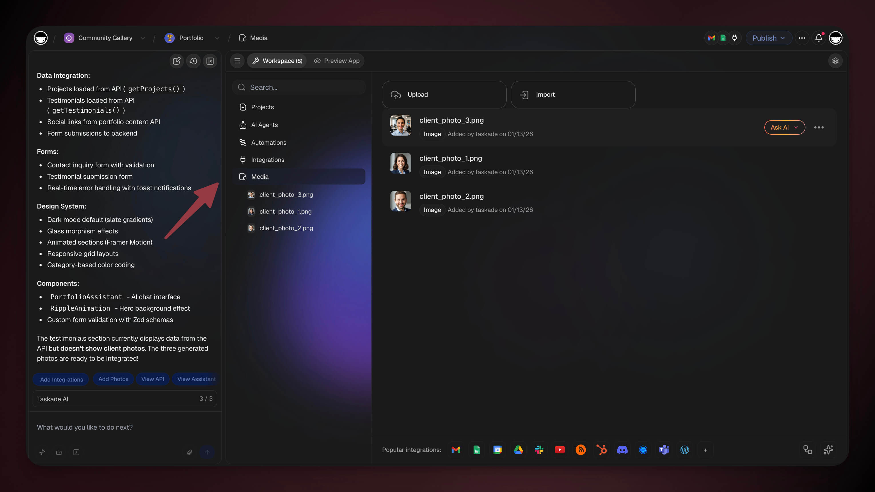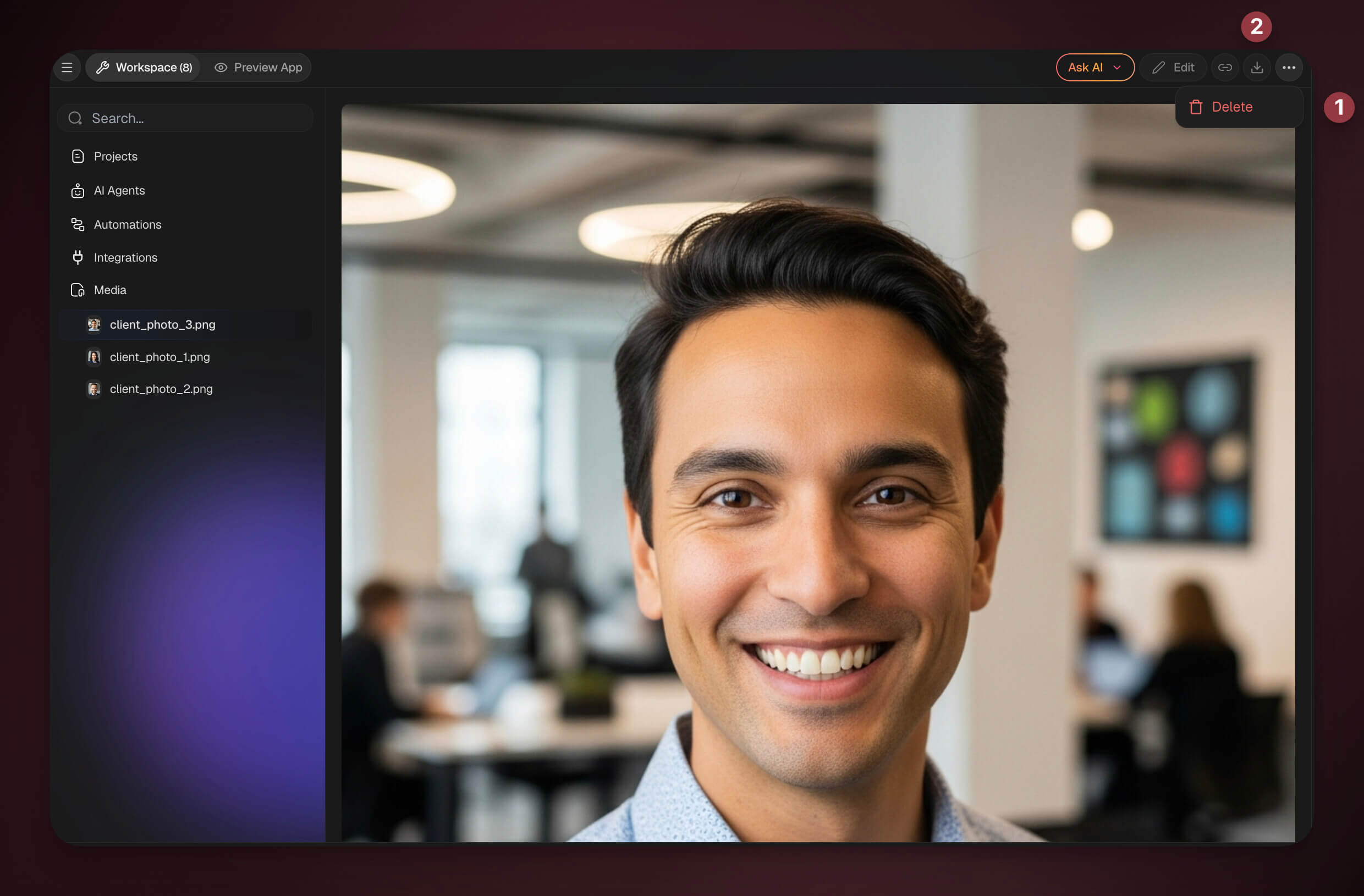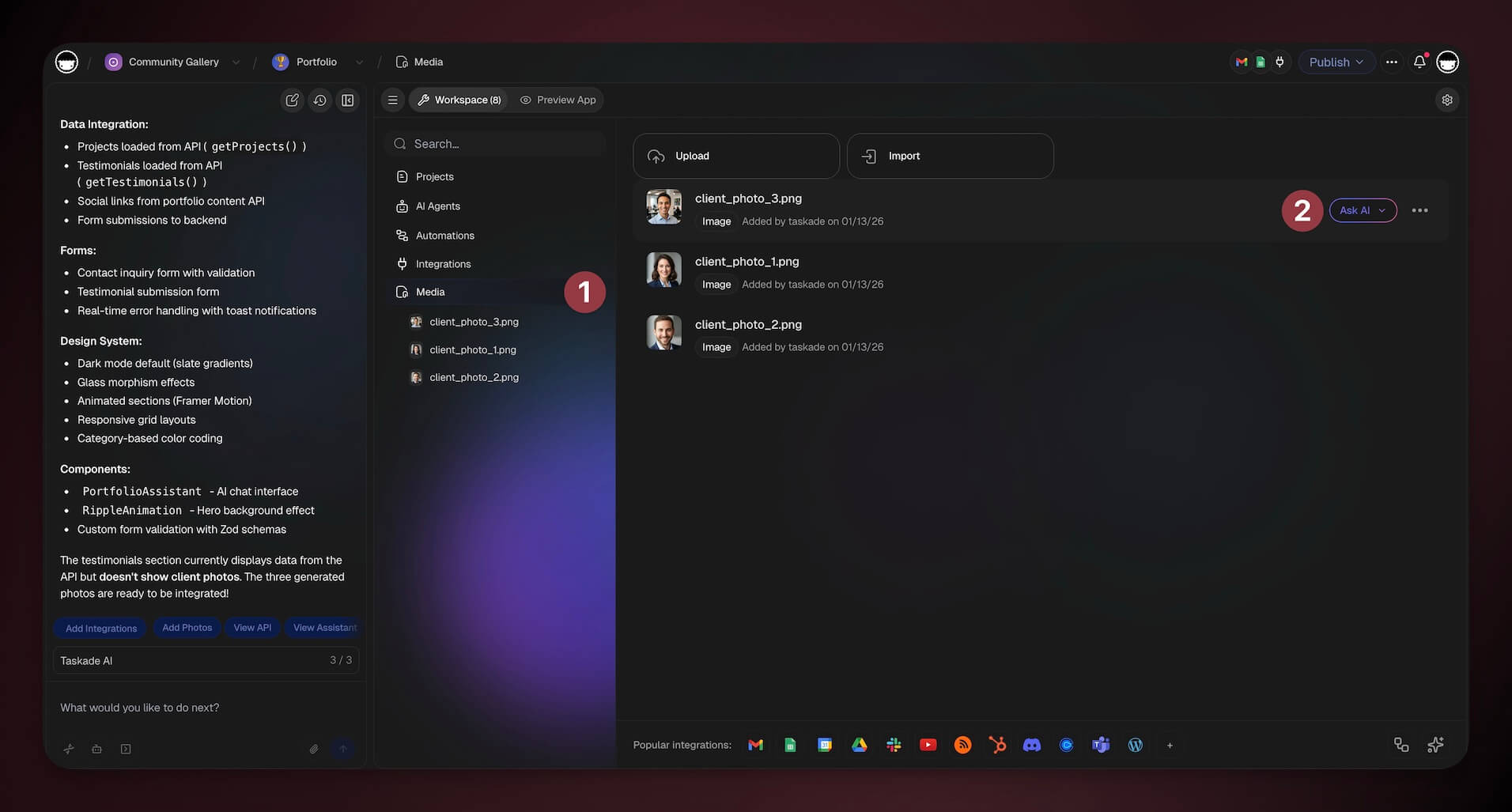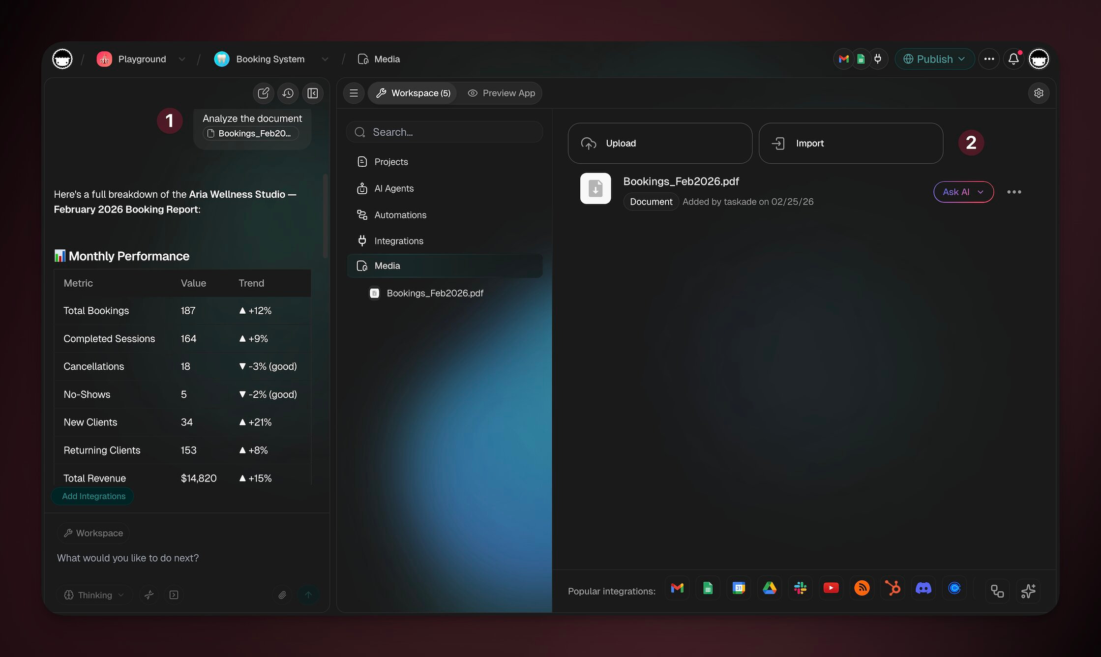 The Media tab is your workspace (and Taskade Genesis app) asset library. Upload and organize files, preview and share them, use in your apps, and start instant Q&A with Taskade AI to extract insights from PDFs, images, and documents.