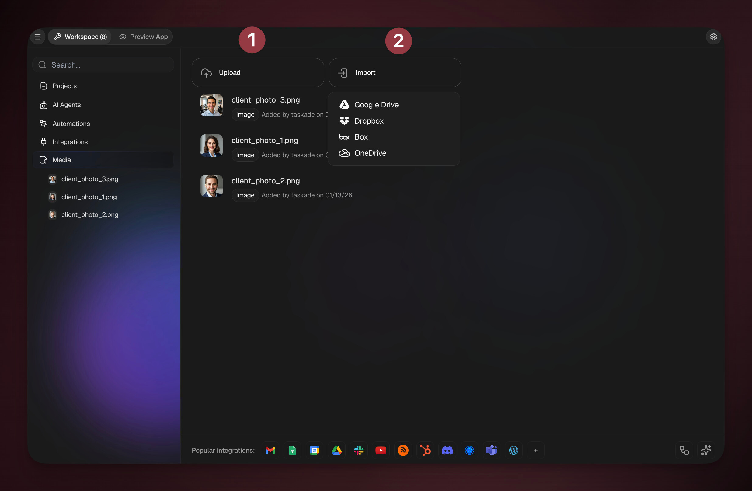 ๐ก Note: Media also aggregates files you upload into projects and Taskade Genesis apps. Visit Upload Files / Attachments to learn more.