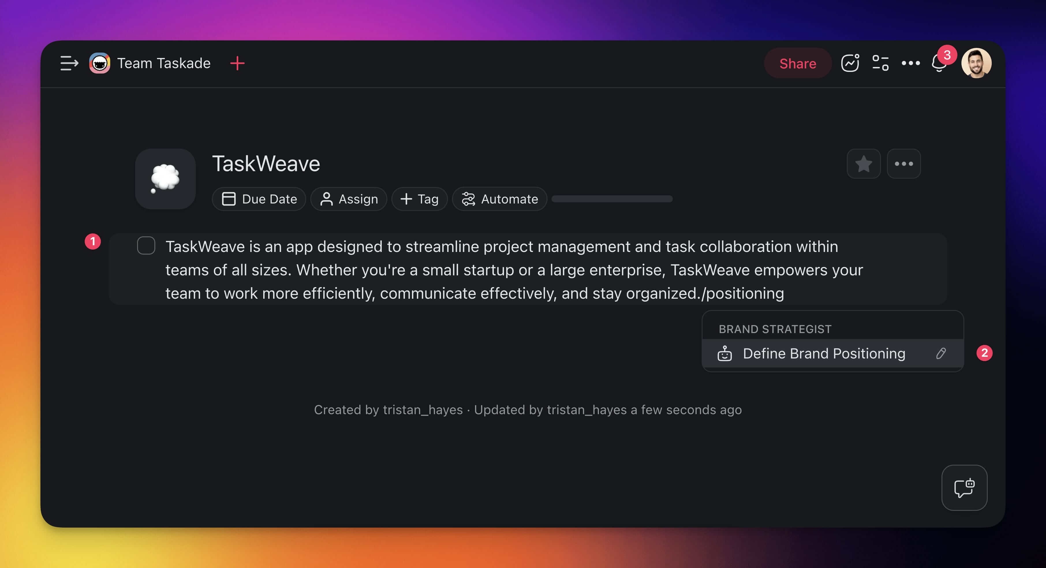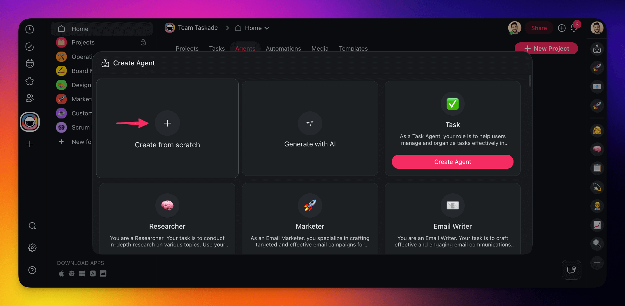 - Bulk-assign tasks to an agent: - Left-click & hold to select the first item in a series. - Drag the mouse cursor up or down to select more items. - Click the 👤 Assign icon that appears in the Multi-Select Toolbar. 1. Choose the agent and you're all set! 2. Create agents following the steps in this article. 3. Each new agent will be added to the sidebar on the right. 4. Click avatars in the sidebar to interact with agents.💡 Note: You can deploy multiple agents to work on the same task.