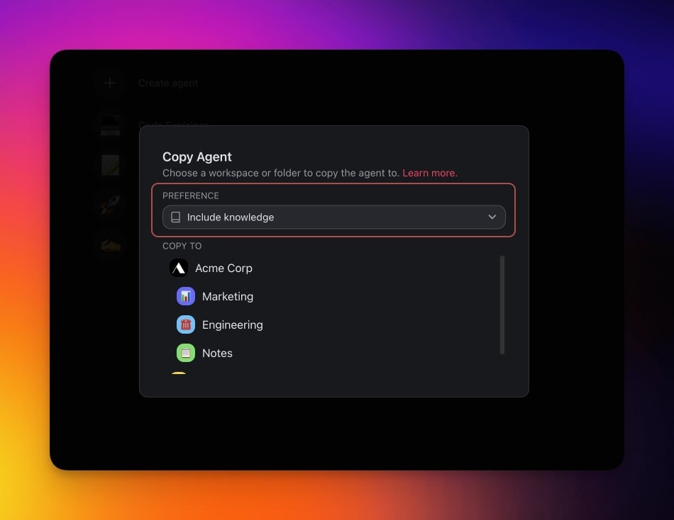 Shared agent chats let your team interact with custom AI agents together. Collaborate on problem-solving, generate ideas, and ensure everyone benefits from AI insights.