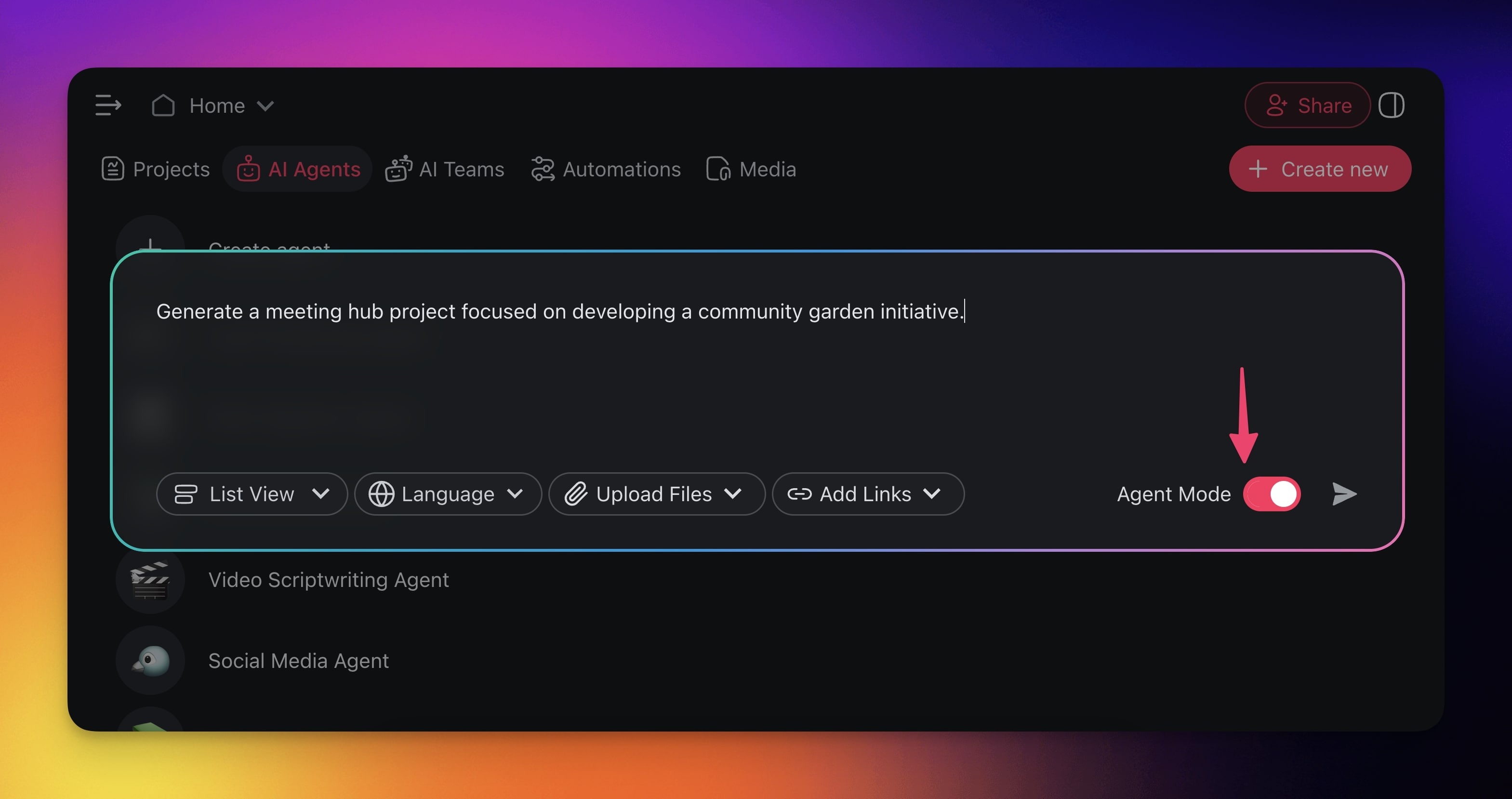 Each time you create a project, you can instantly generate an AI agent customized for it. The agent will learn from the project and dynamically update its knowledge.