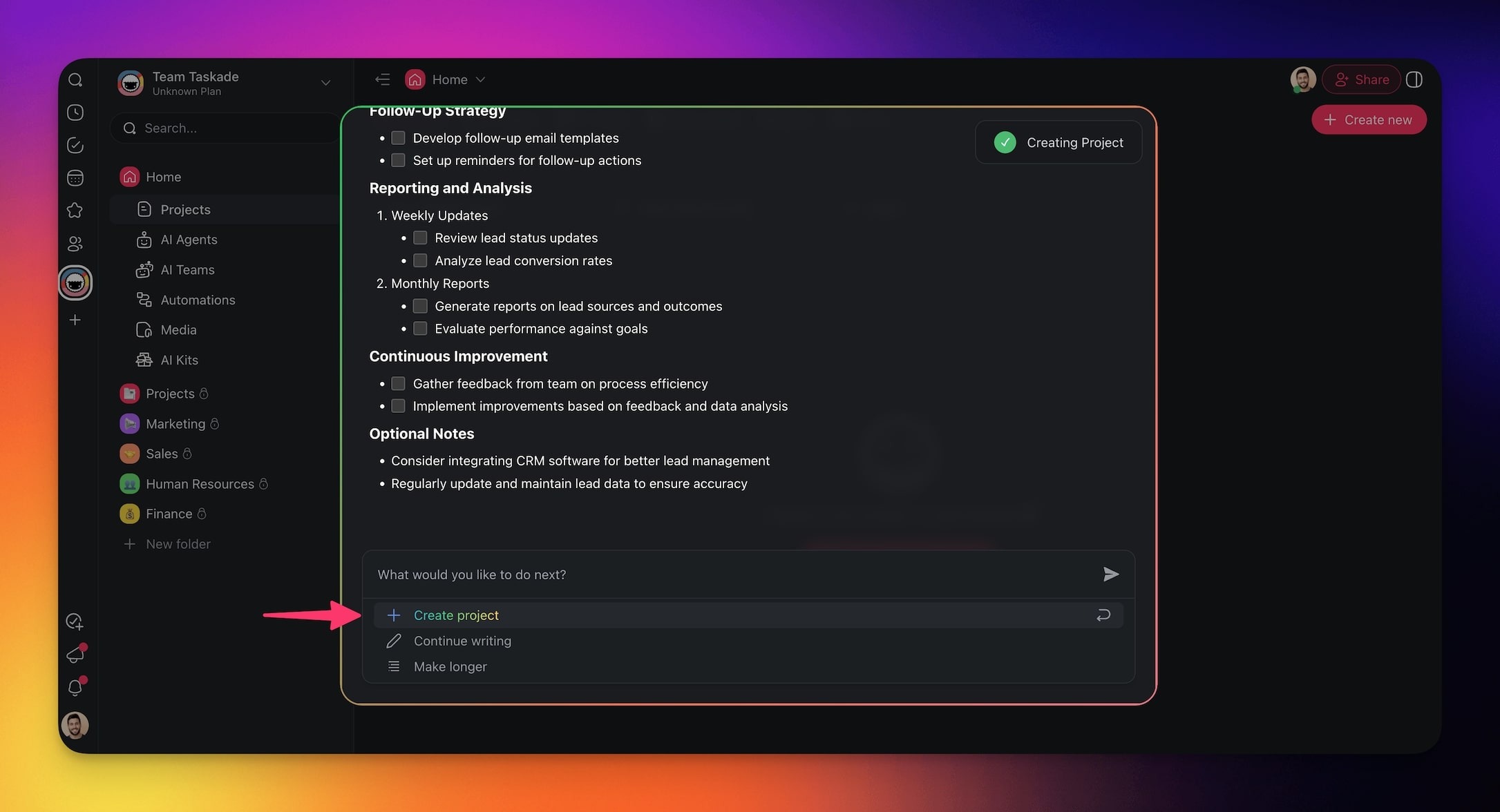 Want to generate a main task and a comprehensive list of accompanying sub-tasks for a specific project or objective? Here's how to use the task generator inside project nodes.