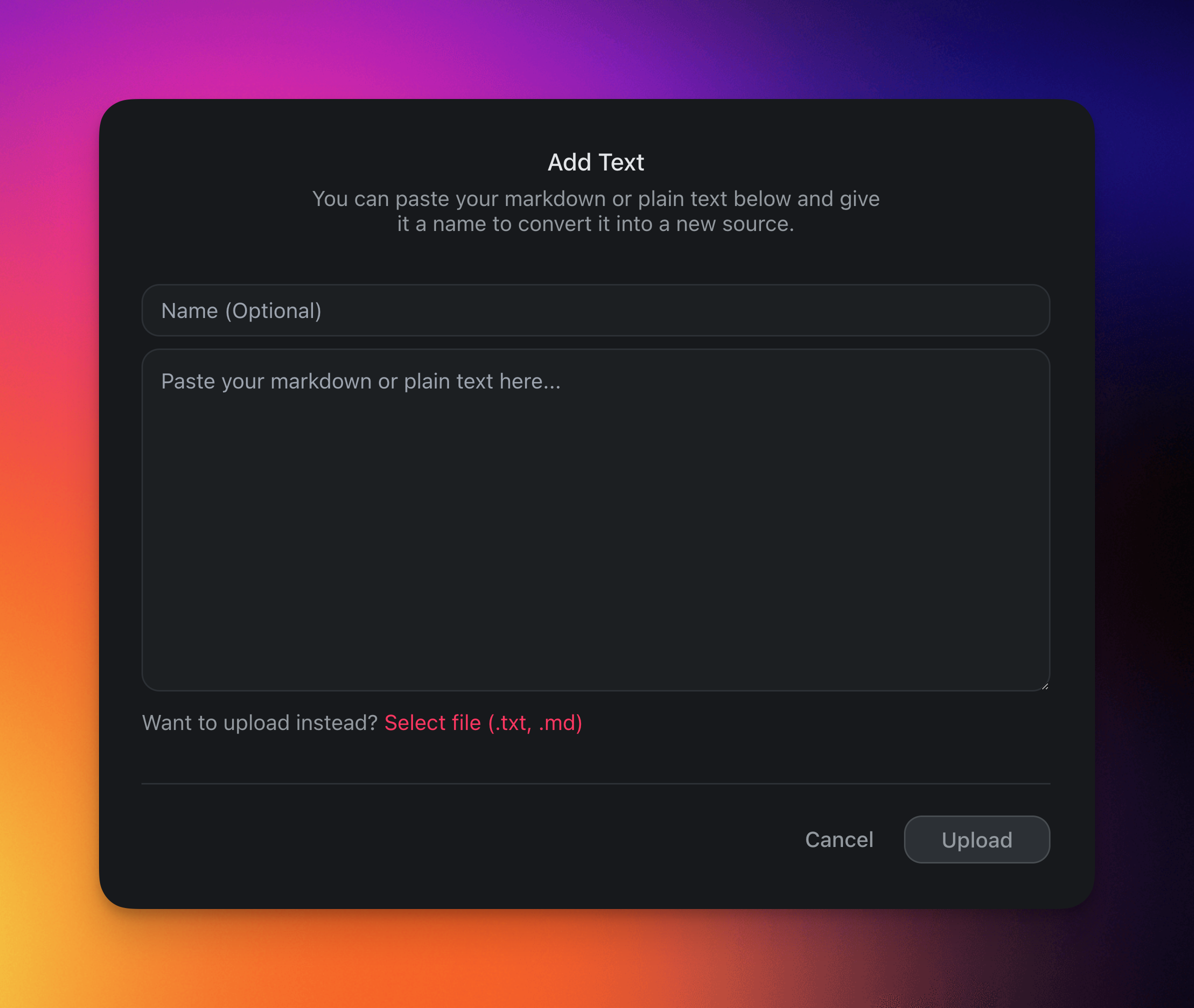 | Pasted Text | Plain text, Markdown | Quick notes, raw content |