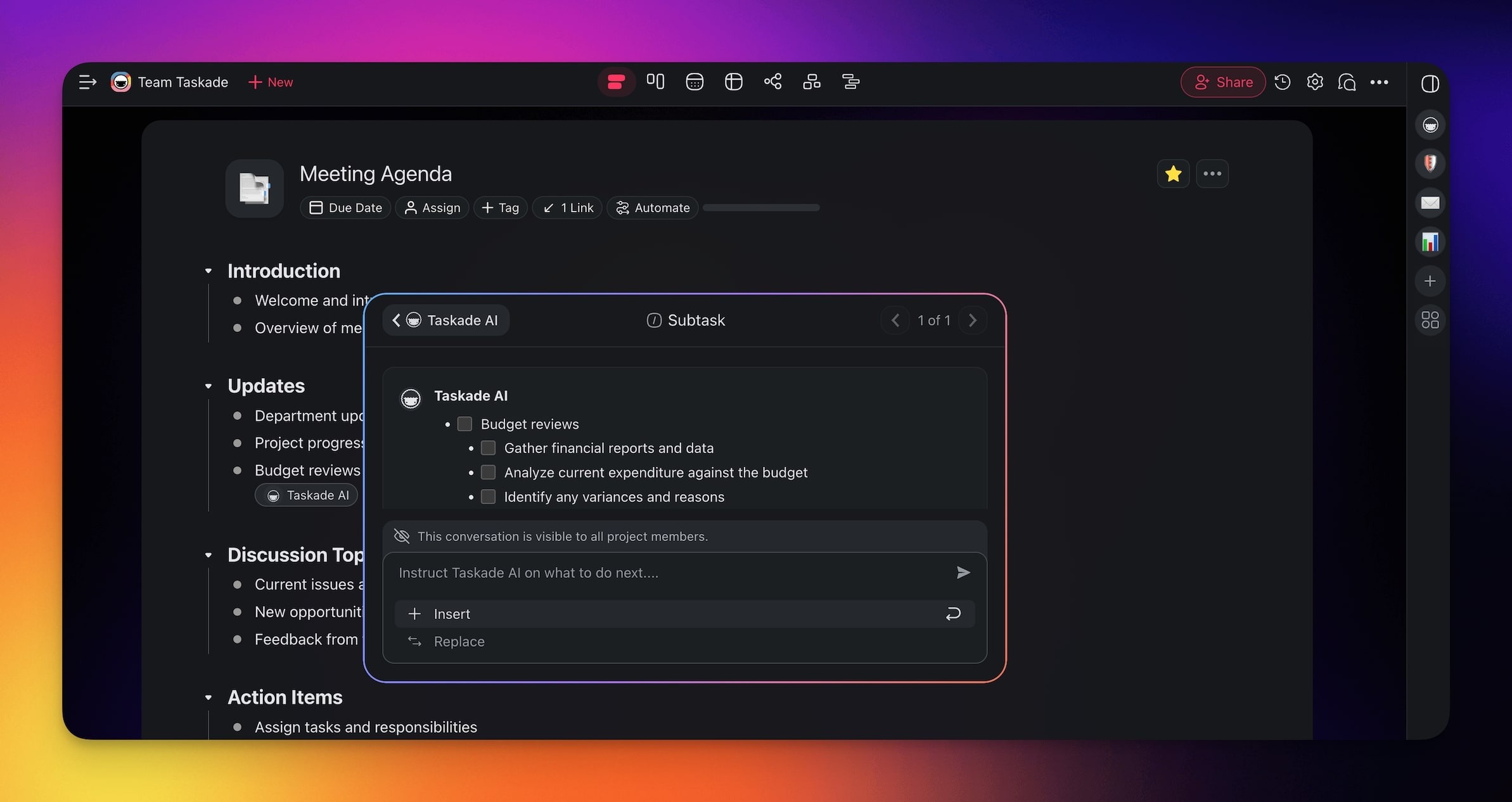 ๐ก Note: Visit Taskade AI Assistant to learn more about editor commands.
