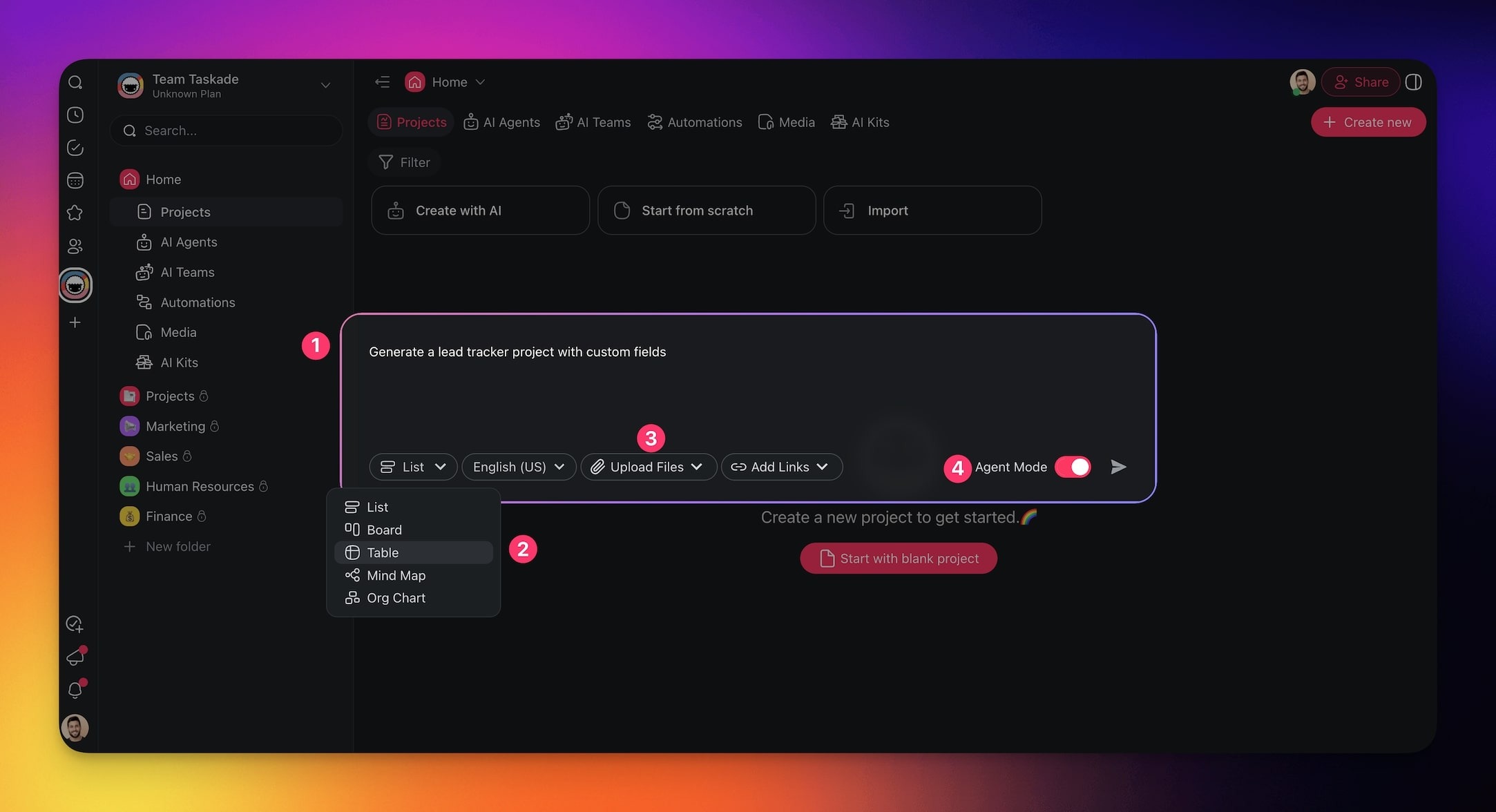 Taskade EVE Tip: You can also ask Taskade EVE to generate projects for you. Just describe what you need โ "Create a product roadmap for Q2" or "Build a marketing campaign tracker" โ and Taskade EVE will use the AI Project Studio to build it instantly.