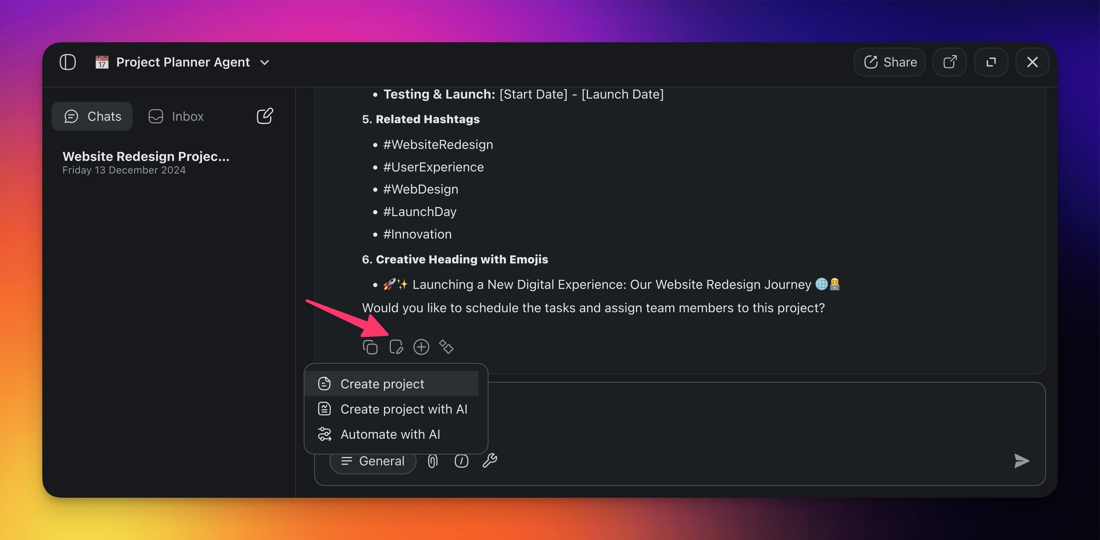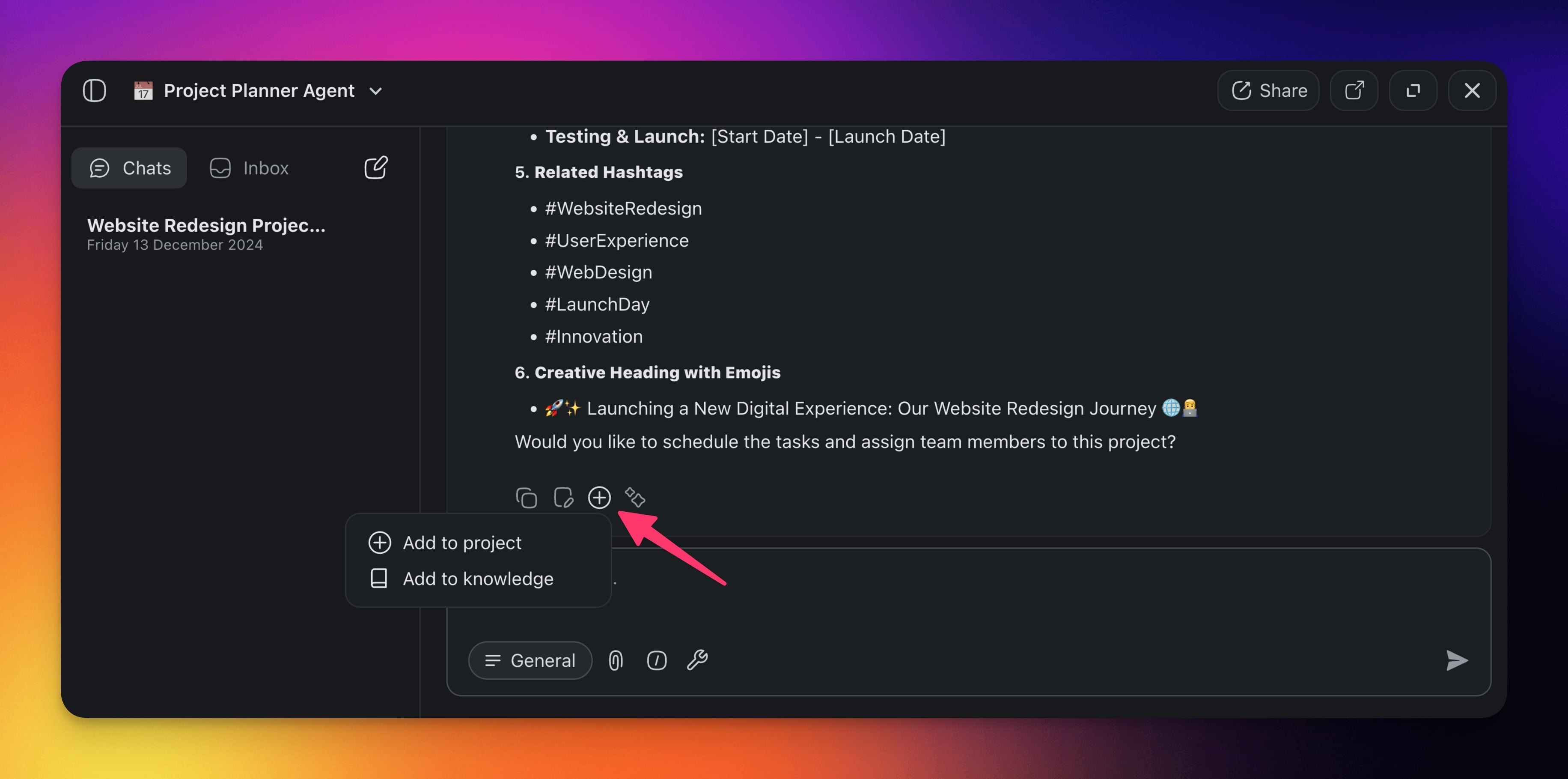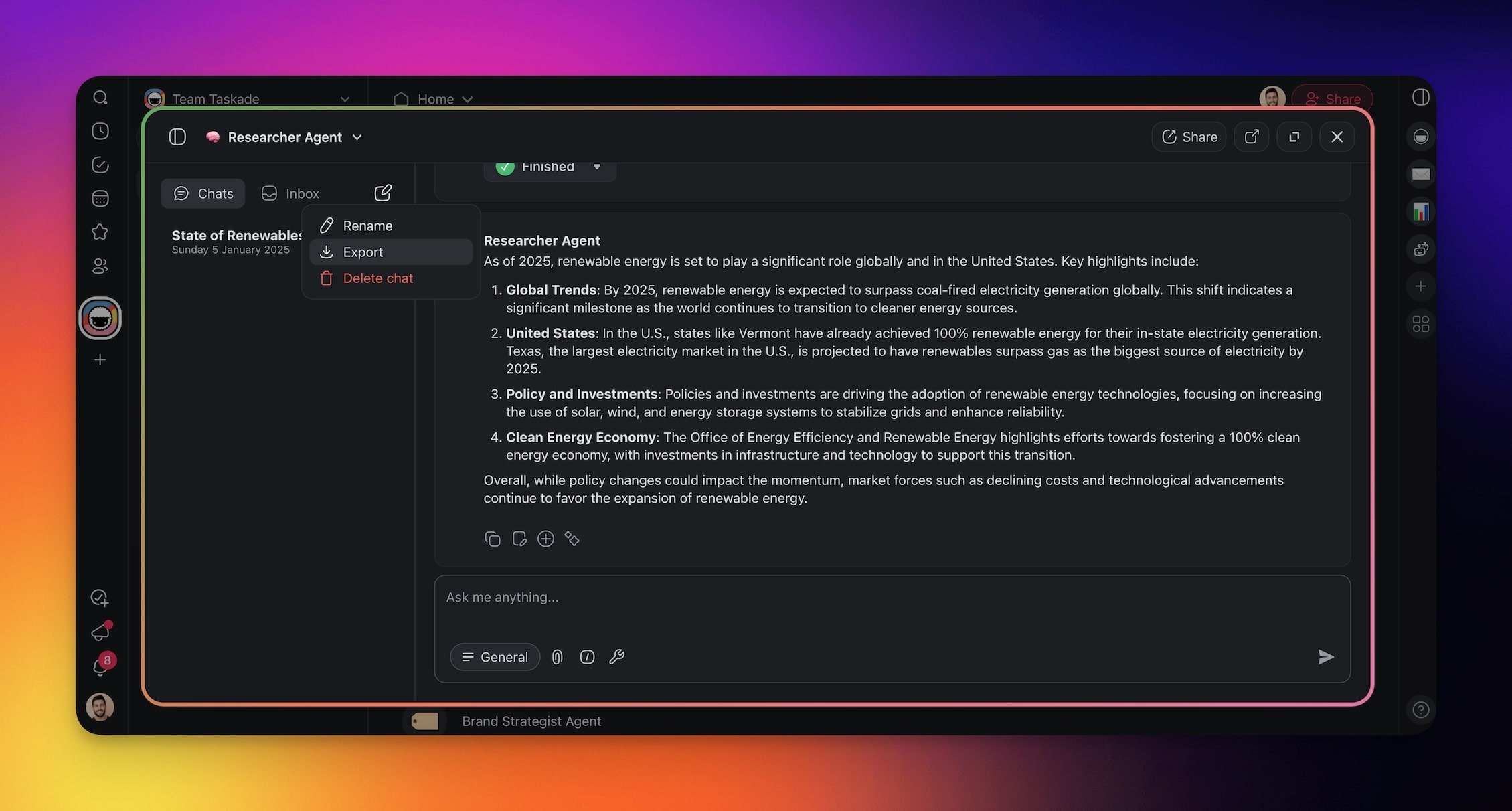 Shared agent chats allow you and your team to interact with custom AI agents collaboratively. Engage in collective problem-solving, generate ideas, and ensure that all participants can contribute and benefit from AI-driven insights.