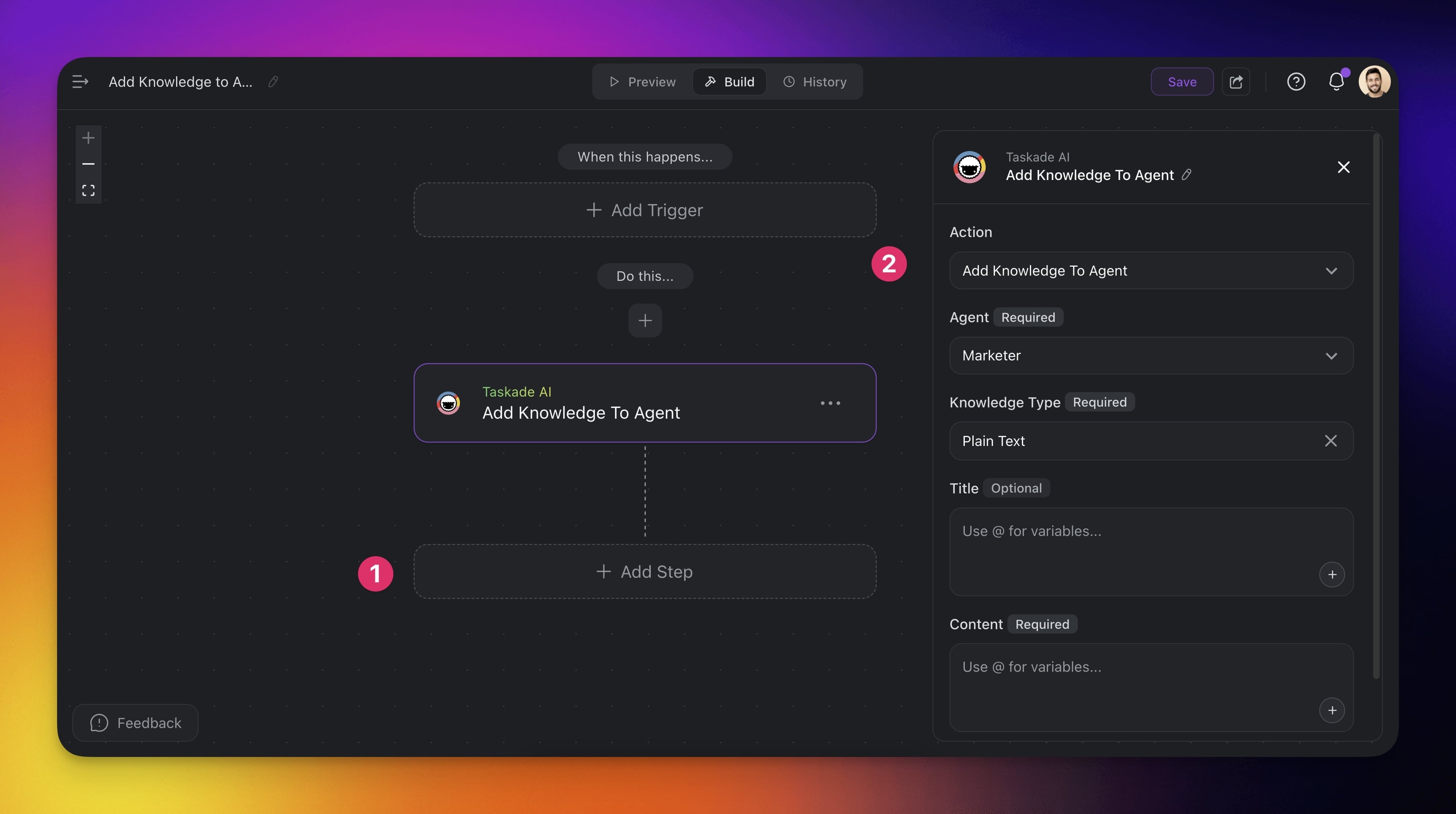 The Add Knowledge to Agent automation action lets you grow your AI agent’s knowledge base automatically. You can pass in content from a variety of sources — structured or unstructured — and Taskade will store it as searchable knowledge.