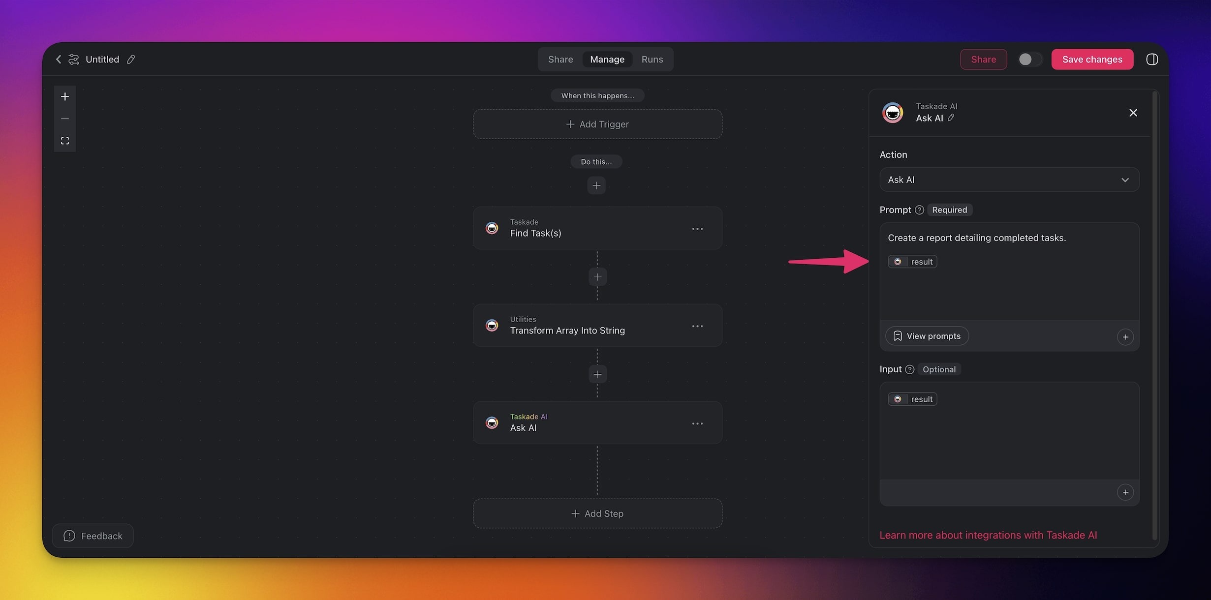 The Transform Array into String action converts the output of the Find Task(s) and Find Row(s) actions to a single, formatted string. This allows you to pass the list of items (array) directly to subsequent actions or AI Agents for further processing.