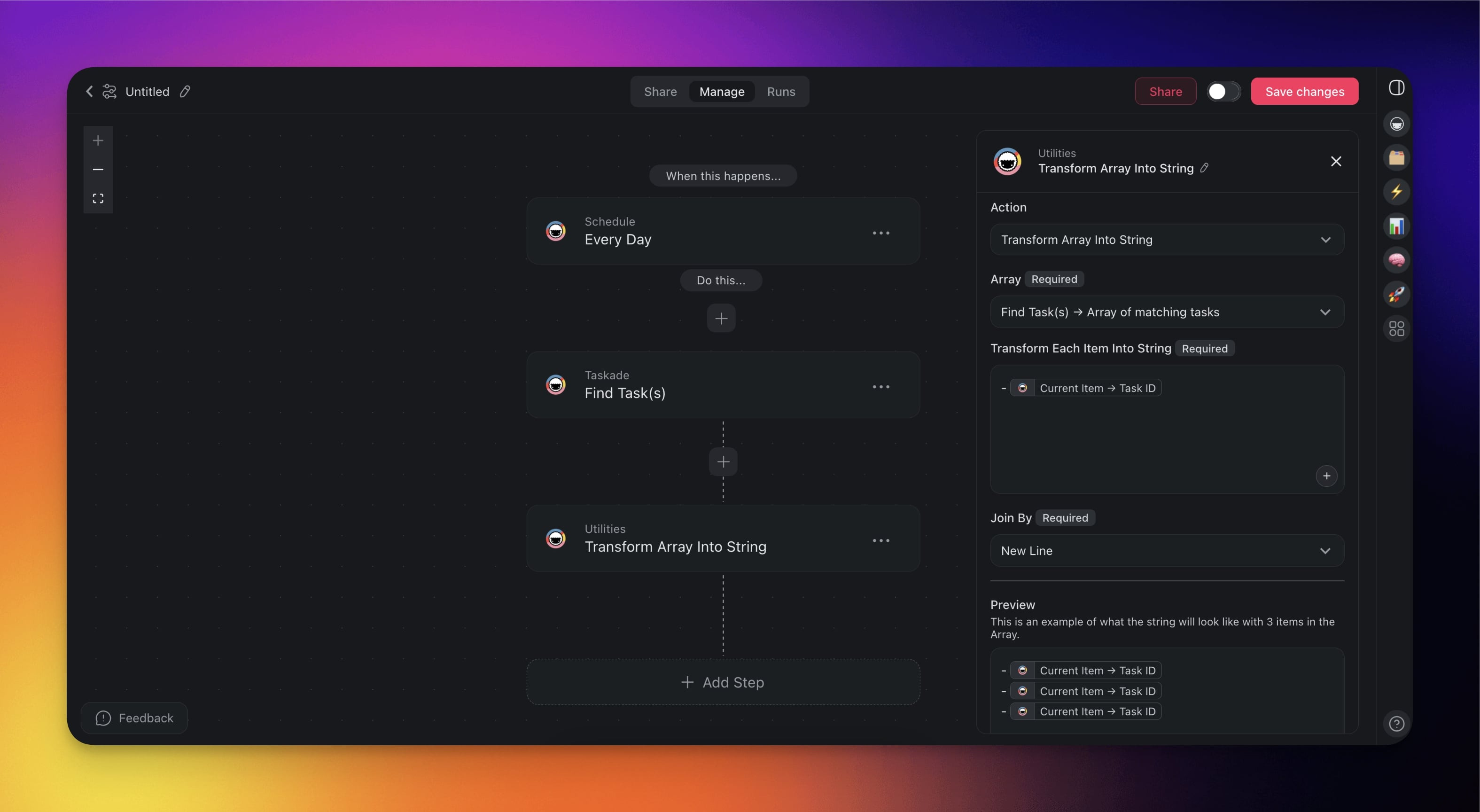 Trigger: Schedule (e.g., 10 AM daily) ā”ļø Find Task(s) ā Status: In Progress ā”ļø Transform Array to String ā”ļø Post summary to a project |