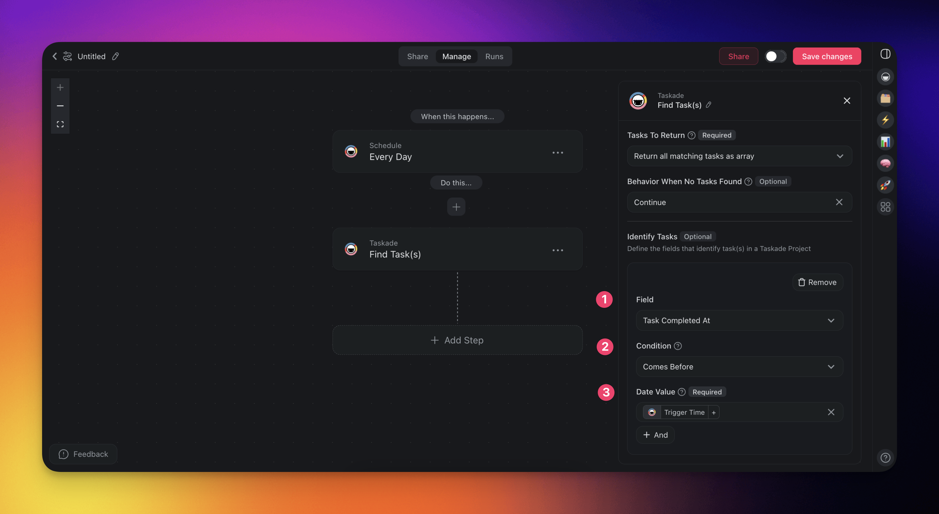 The Find Task(s) action allows you to search for tasks within Taskade projects based on specific criteria. This action is essential for automating workflows that require retrieving, filtering, and processing task data dynamically.