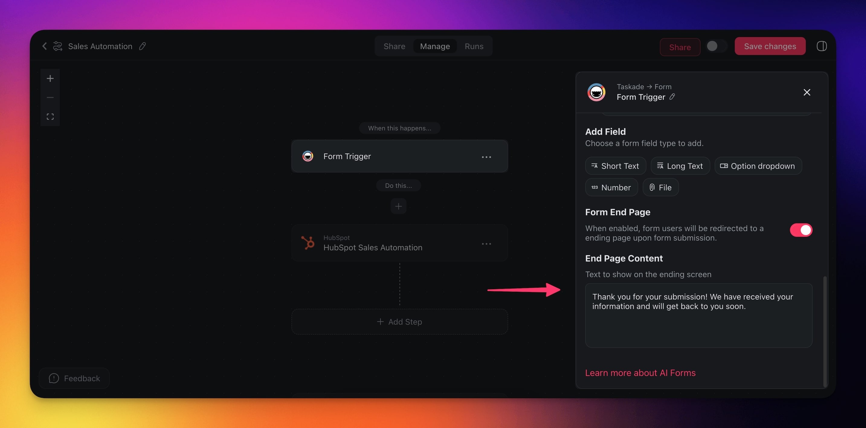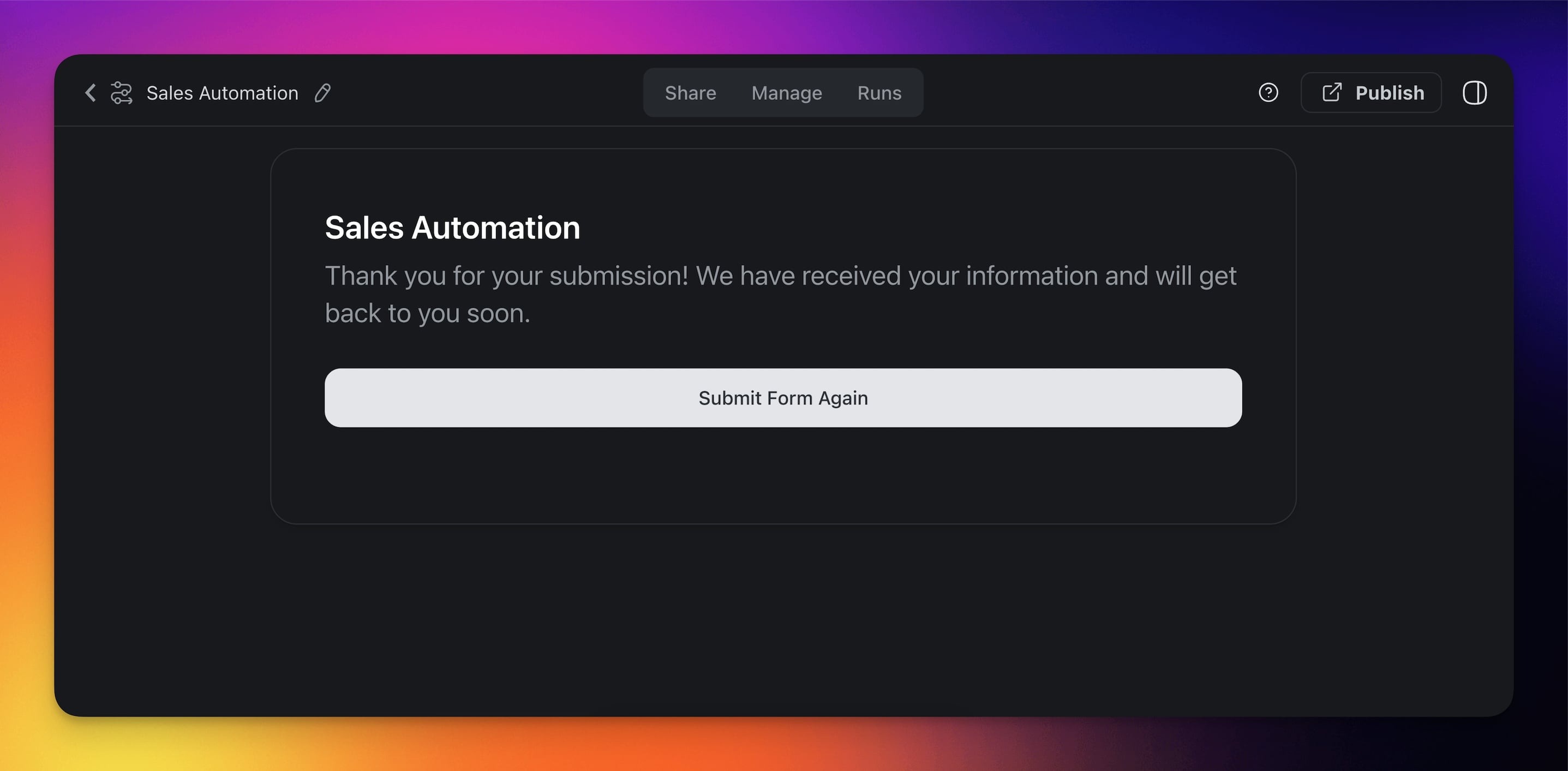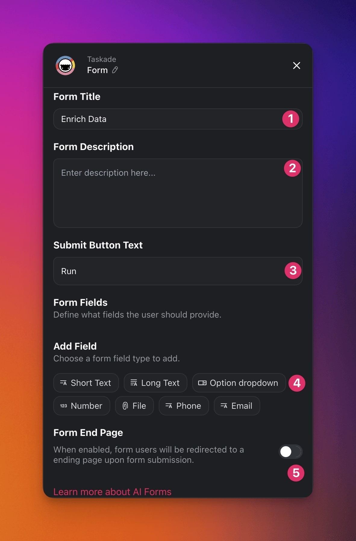 AI Forms let you build forms that collect data and automatically process it with AI. Use them to qualify leads, route support tickets, or gather customer feedback. Results are displayed instantly on the same page for quick follow-up.