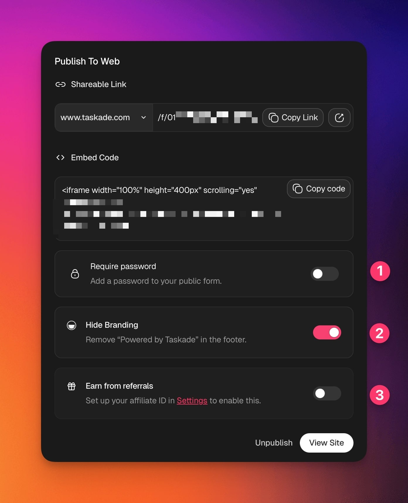 - Earn from Referrals: Turn this on to enable affiliate tracking when users access your form. You'll need to set up your affiliate ID in Settings first.