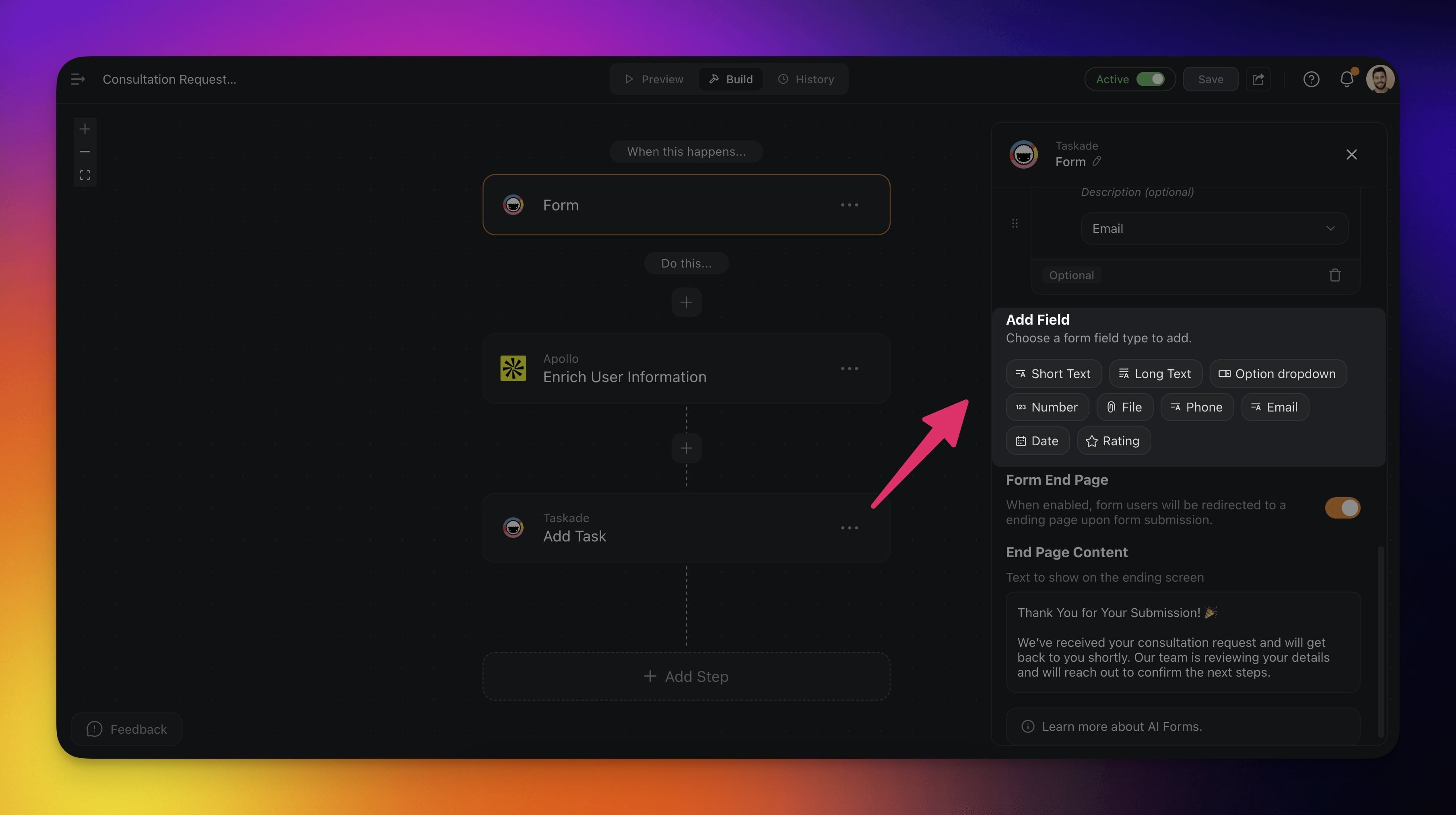 | Add Fields | Add various field types to the form. |