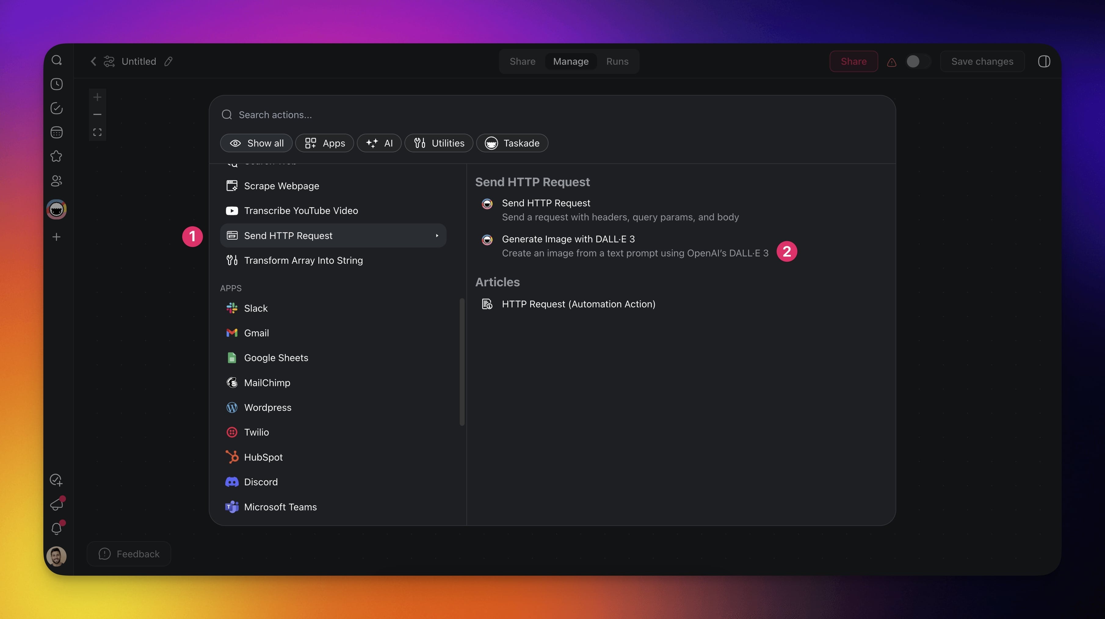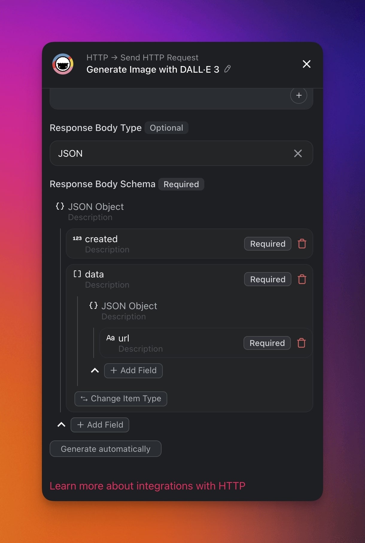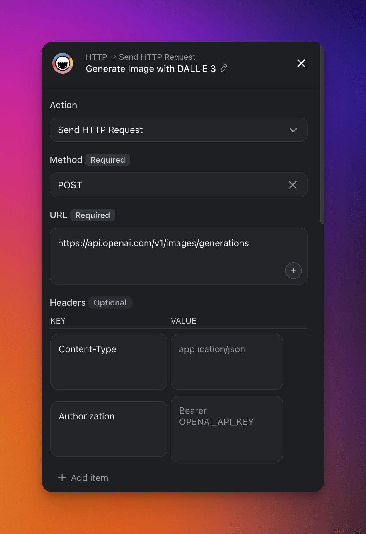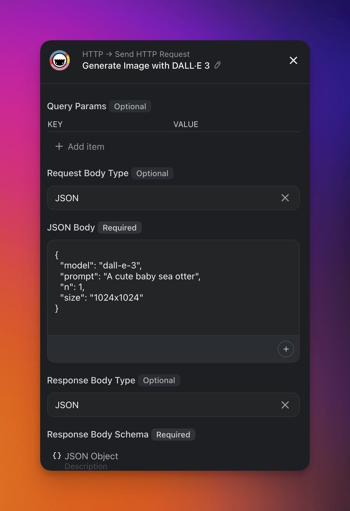 The Generate Image with DALL·E 3 action lets you automatically create beautiful images from plain text prompts using OpenAI’s image generation tools. This action is perfect for generating illustrations, concept art, or any kind of image content.