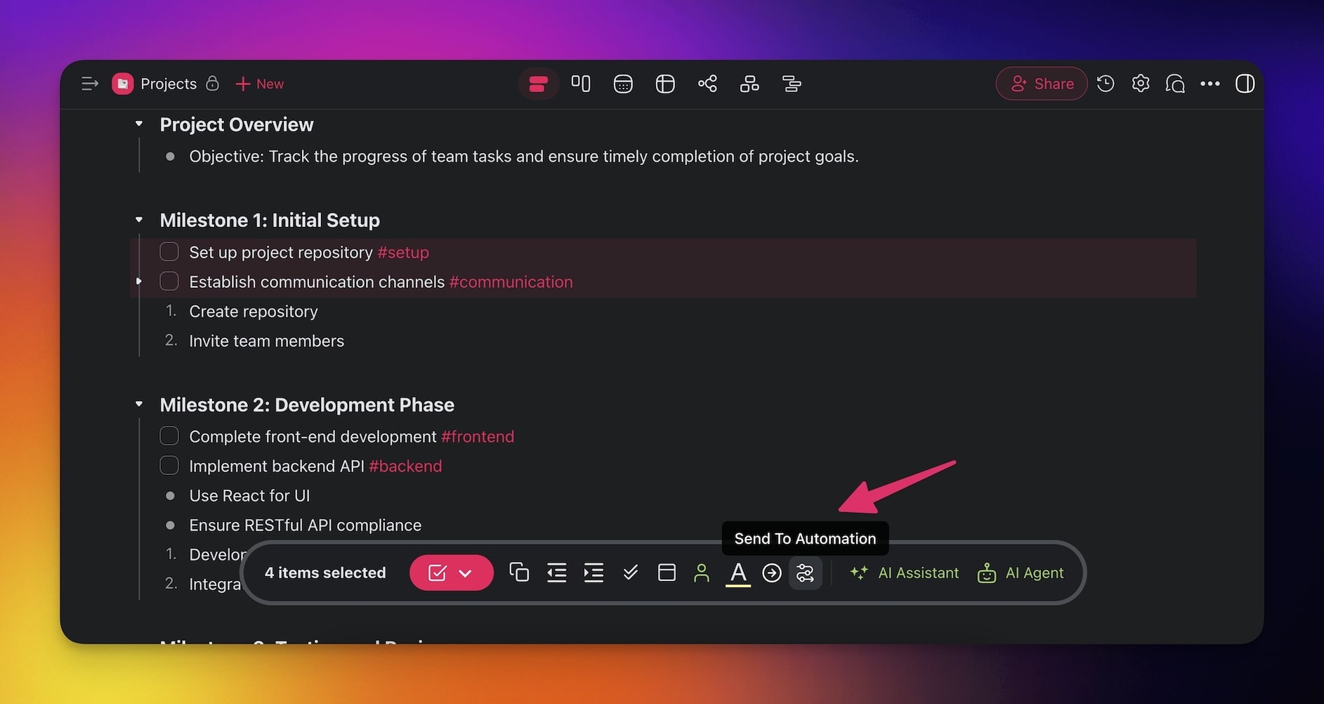 | Bug tracking & escalation | When a critical bug is identified, trigger an automation to notify the engineering team, create a priority issue, and update stakeholders. |