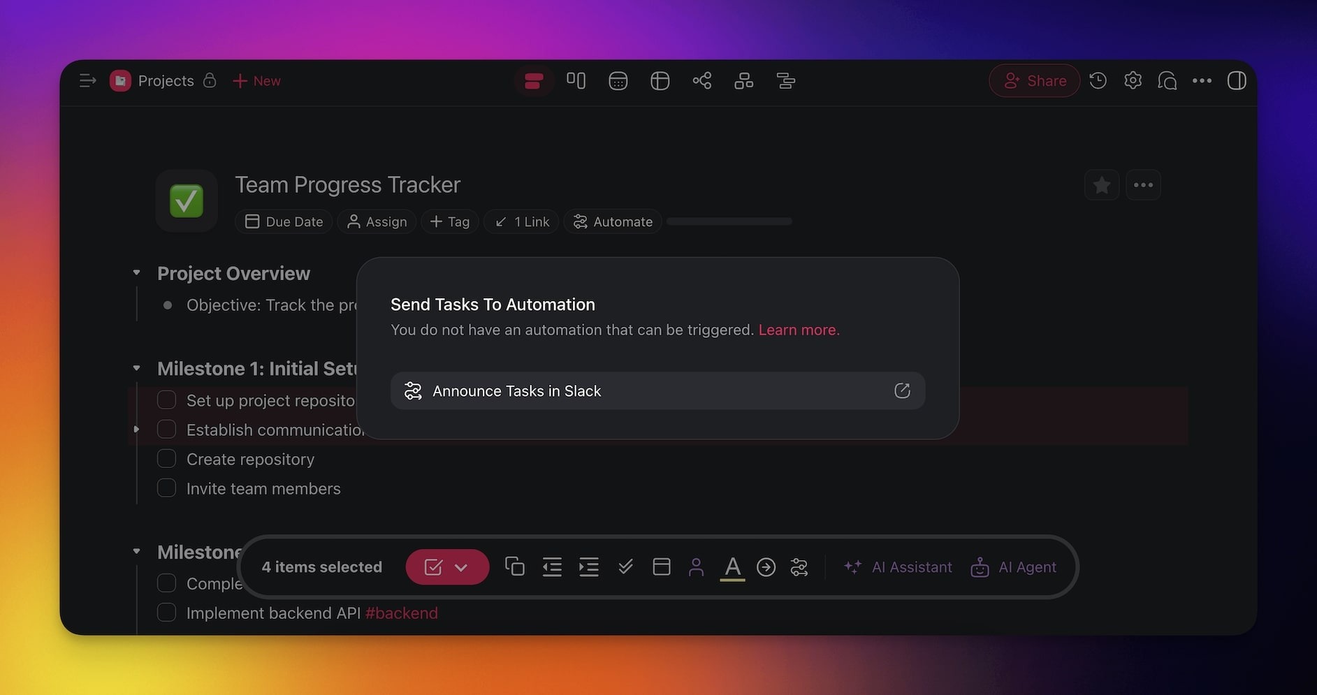 | Client onboarding | Manually trigger an automation to send predefined onboarding emails and assign relevant tasks when a new client project is created. |