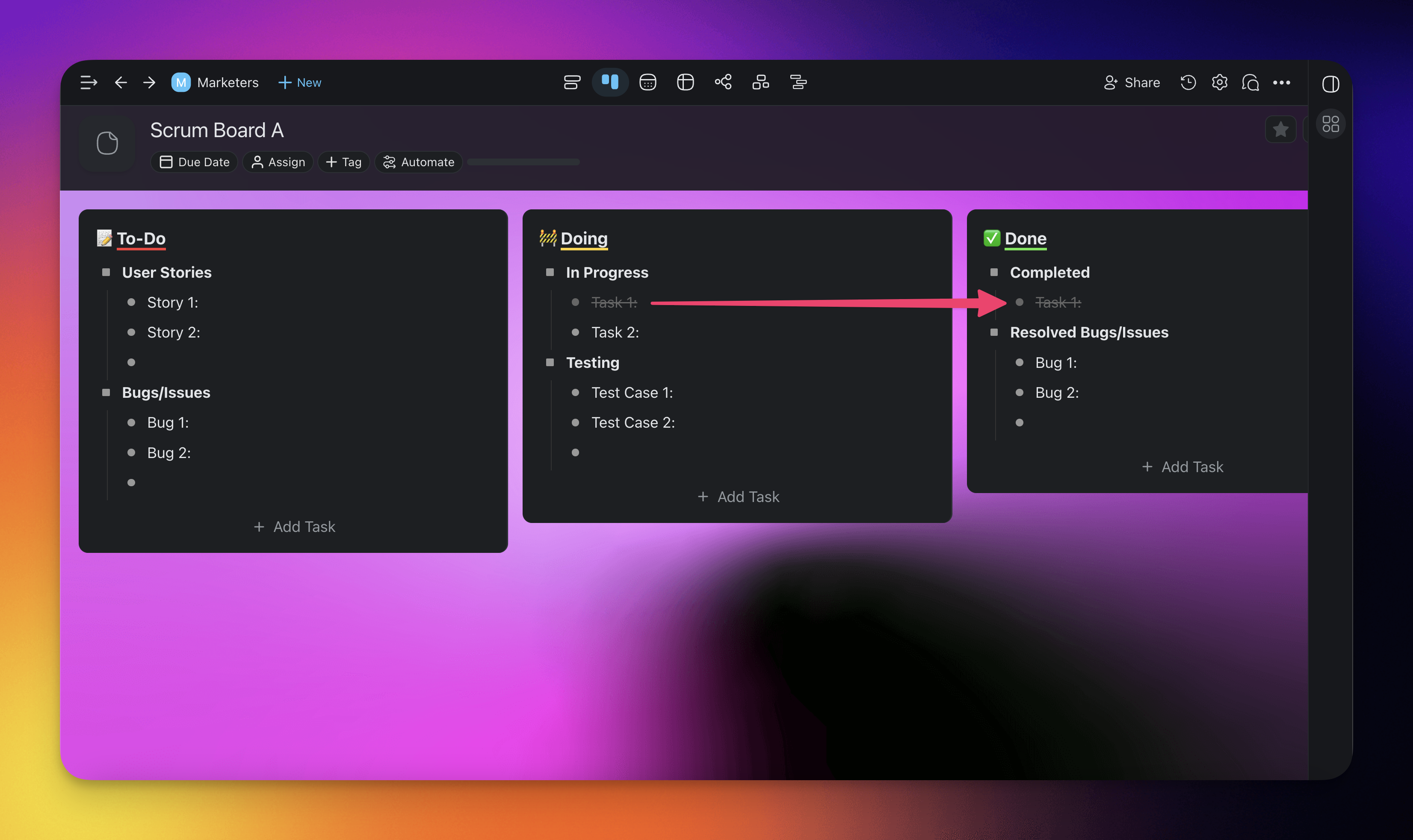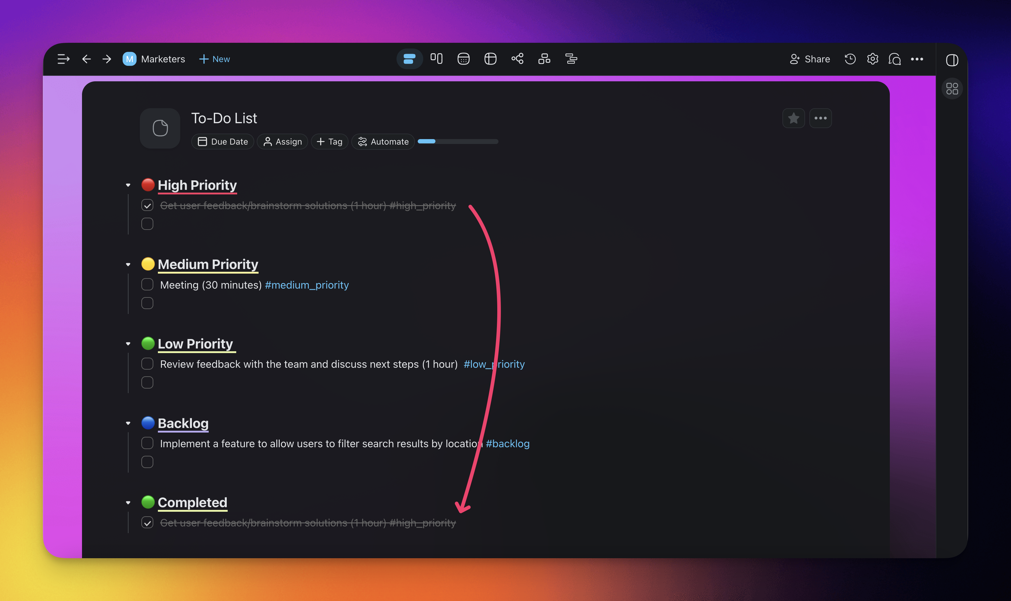 Organise completed tasks within a project to maintain a clear and structured workflow. Automatically categorise and finished tasks, making it easier to review past work, track accomplishments, and keep your project clutter-free.