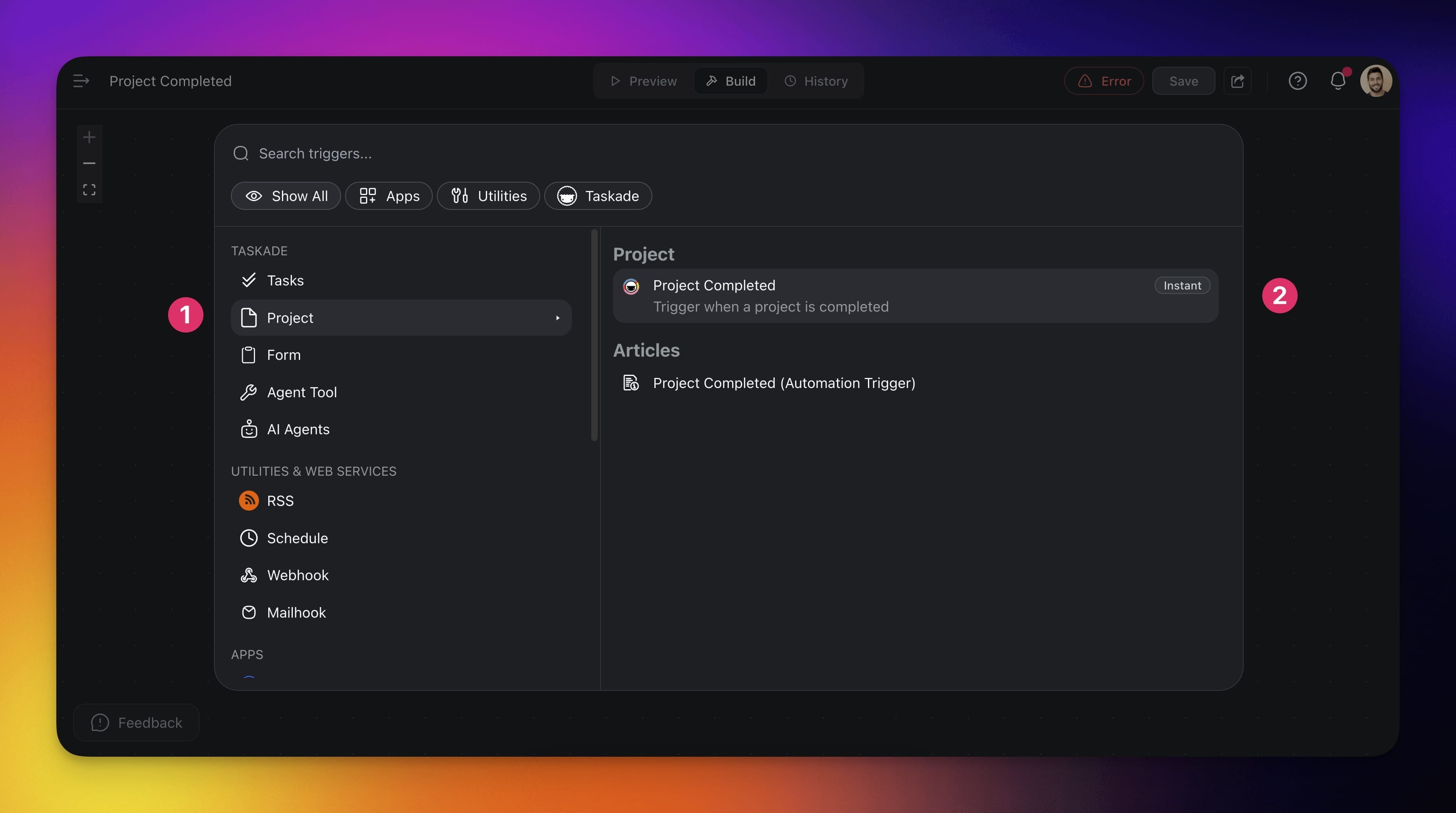 - Click ➕ Add Trigger and choose the Project Completed trigger.
