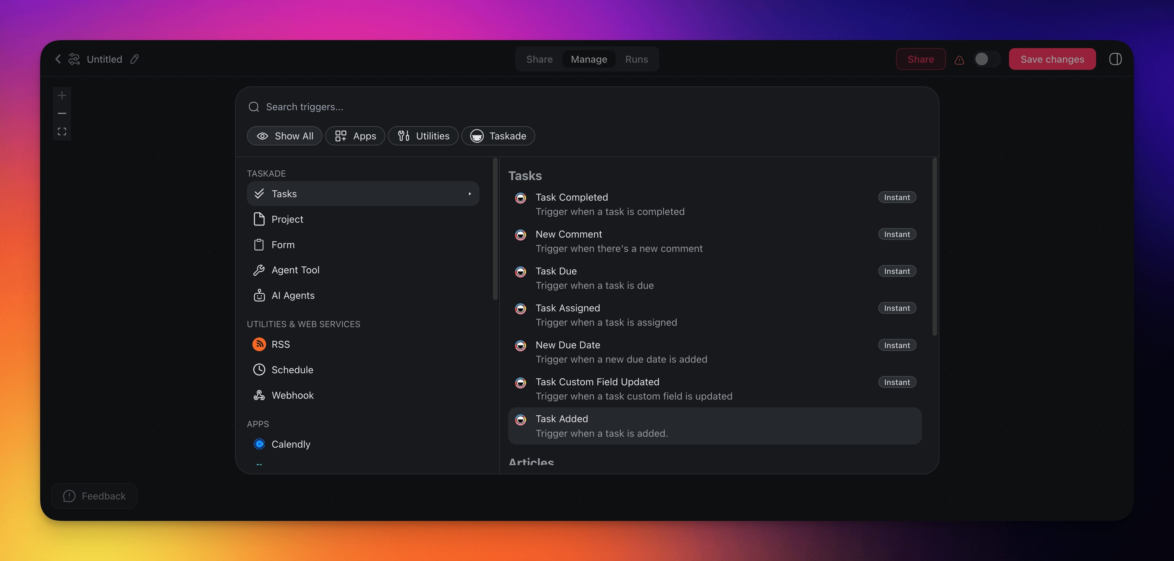 The Task Added trigger automatically runs your workflow whenever a new task is created in a selected Taskade project. It’s an essential building block for automations that rely on real-time task management and progress tracking.