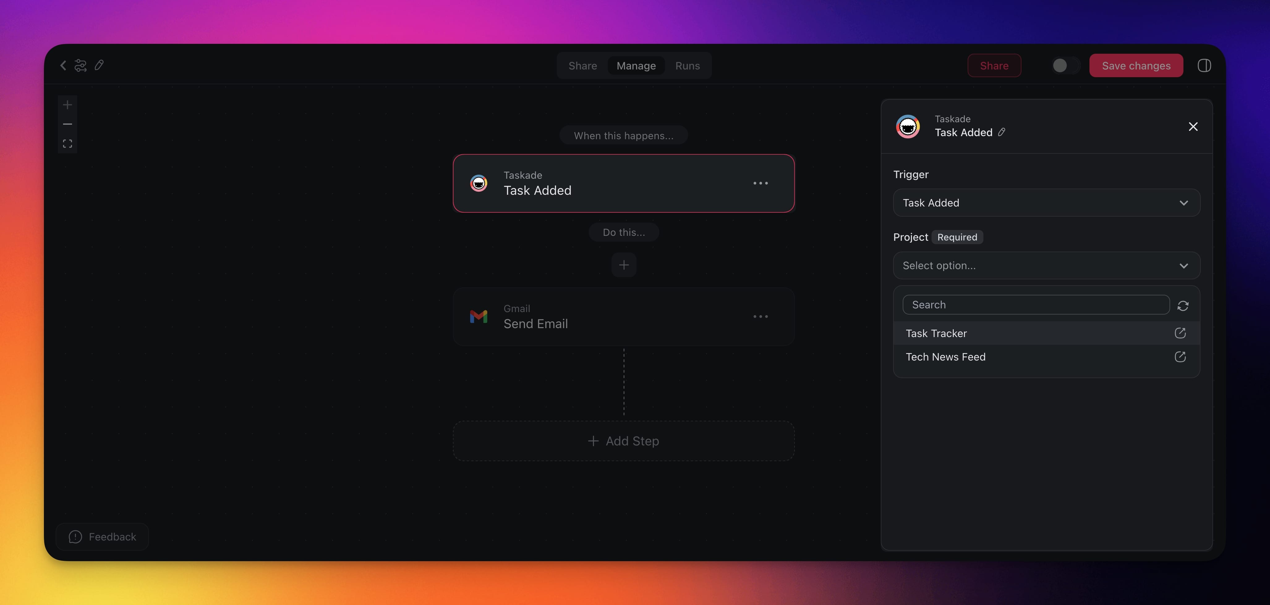 | Project | Select the specific Taskade project to monitor for newly added tasks. |