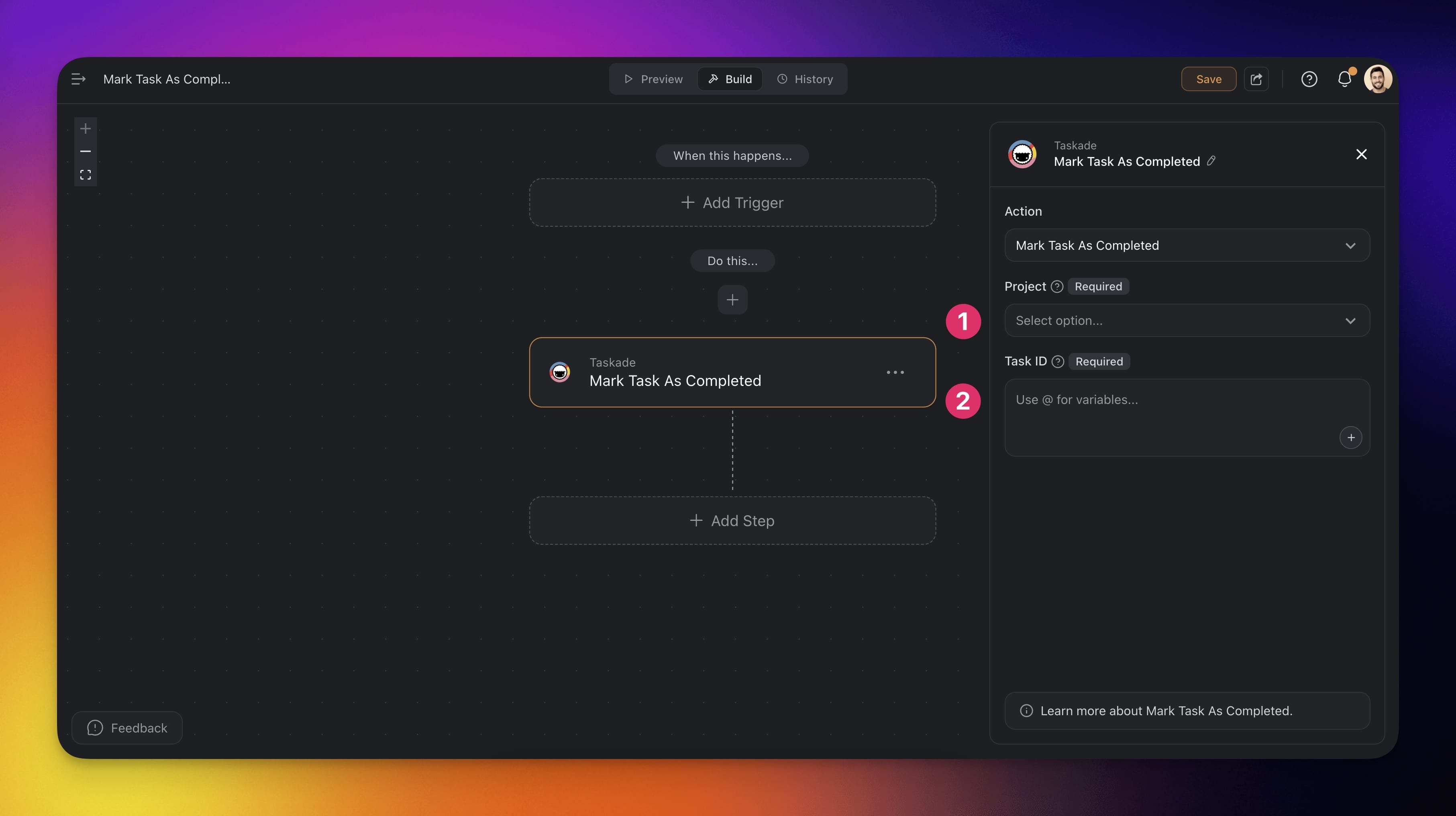 - Specify the Task ID. Use variables from previous steps if needed.