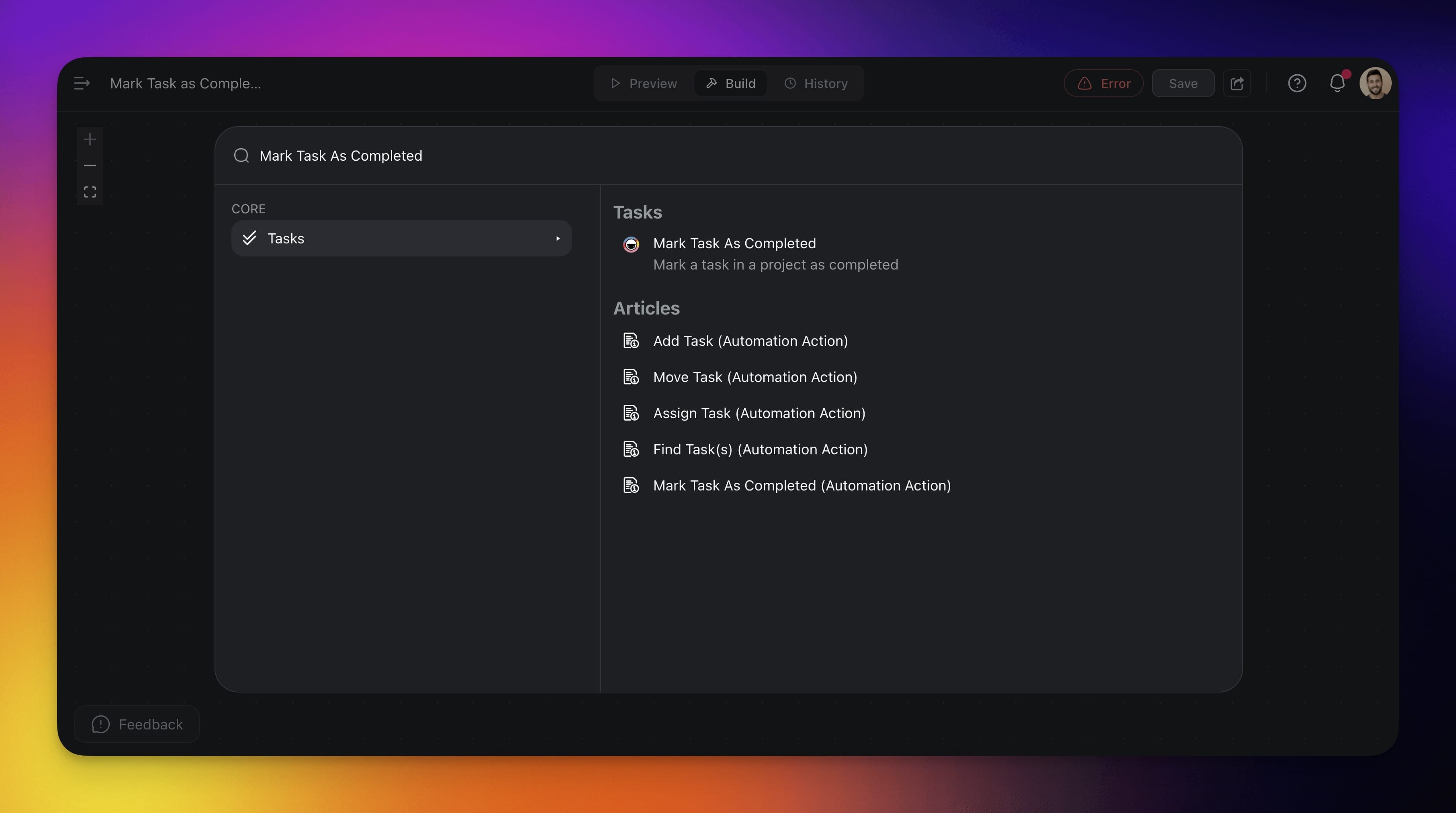 Use the Mark Task As Completed action to automatically update a task's status in a project whenever you want to signal progress or coordinate dependent actions.
