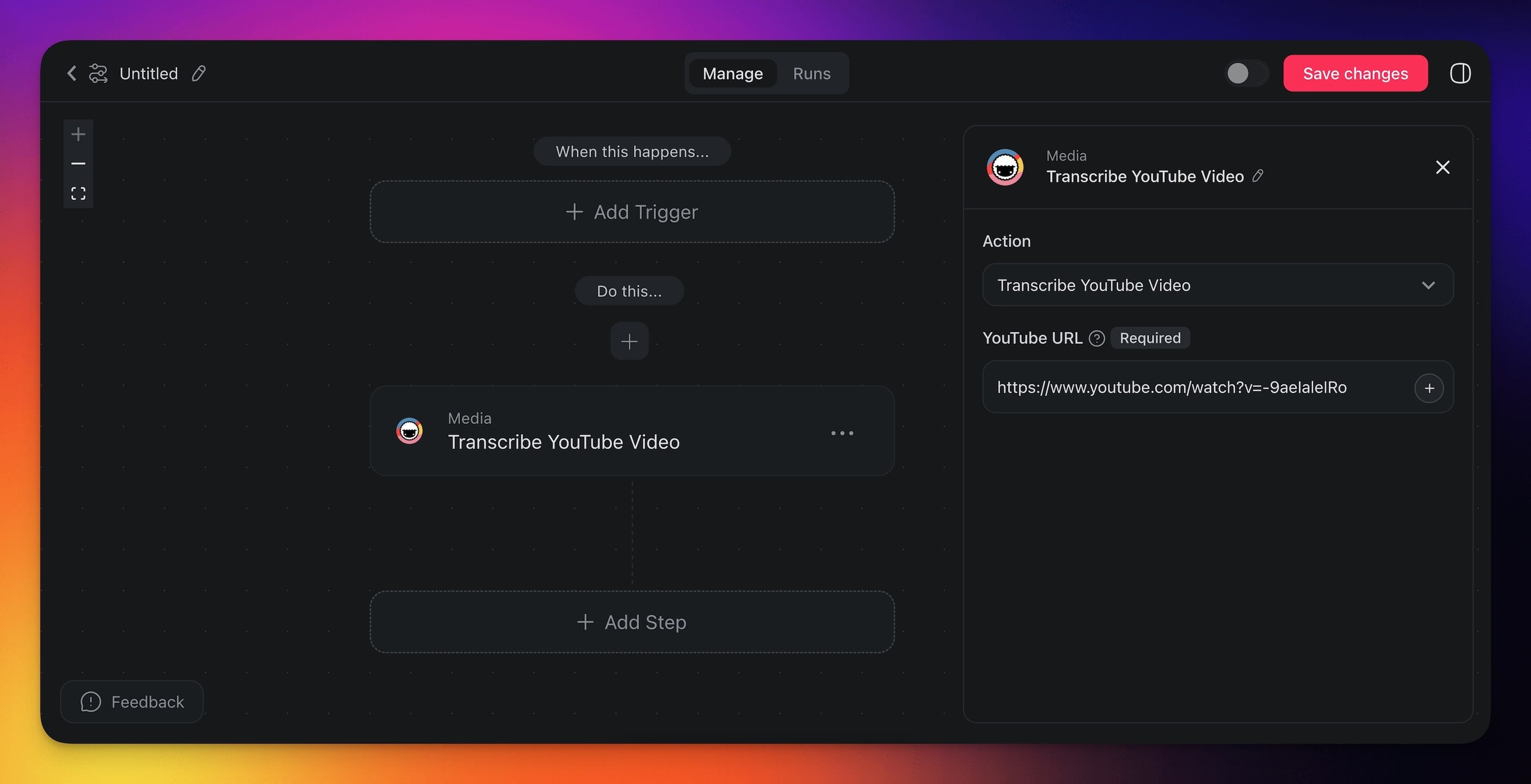 - Click ➕Add Step and choose the Transcribe YouTube Video action.