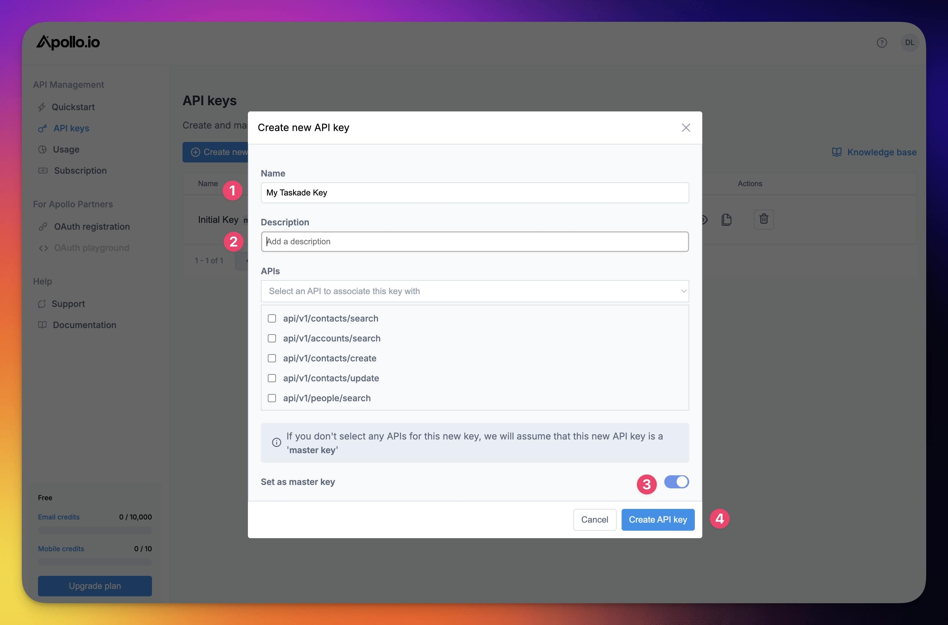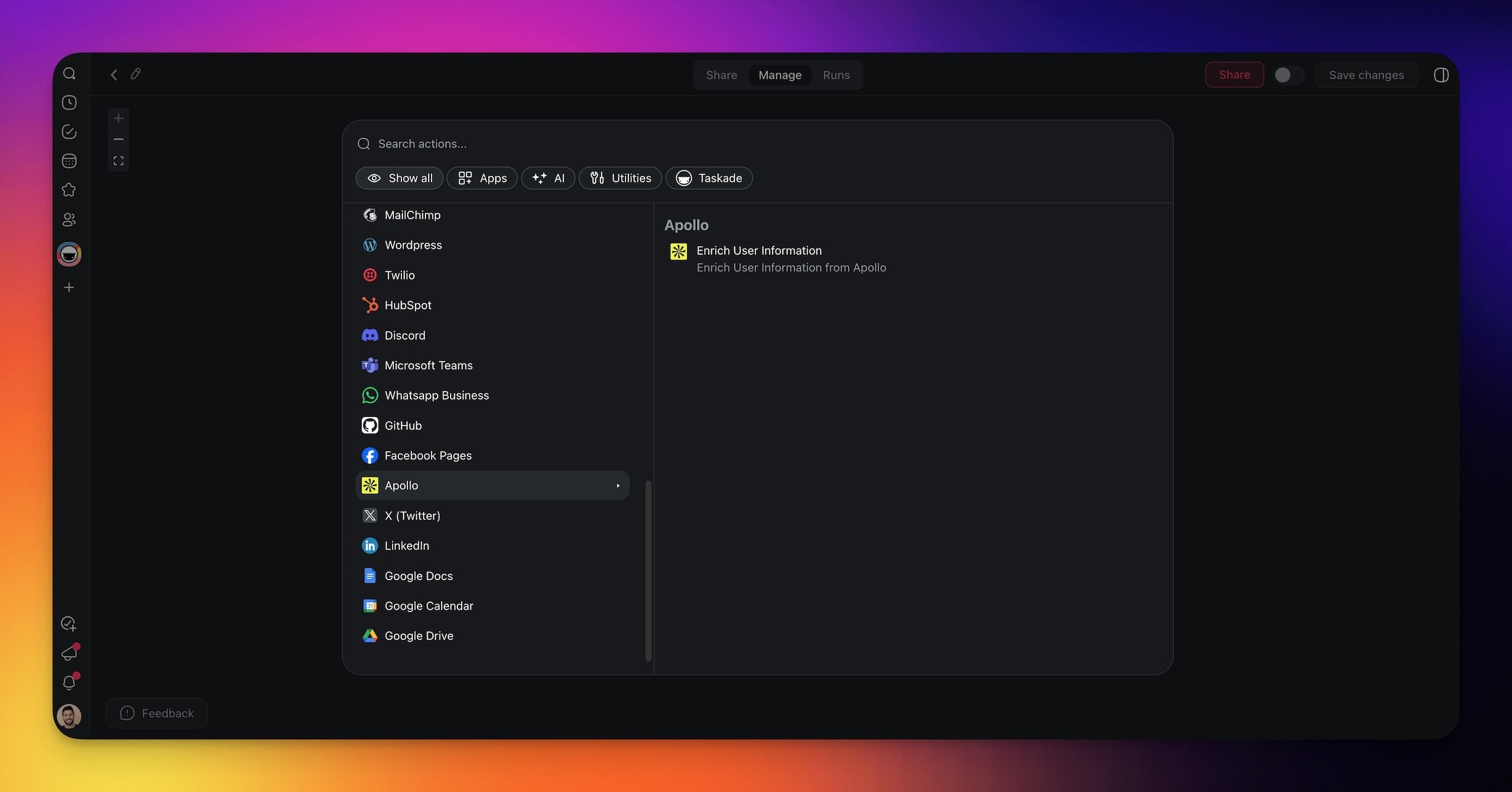 Before you start using Apollo in Taskade, you need to configure the integration: