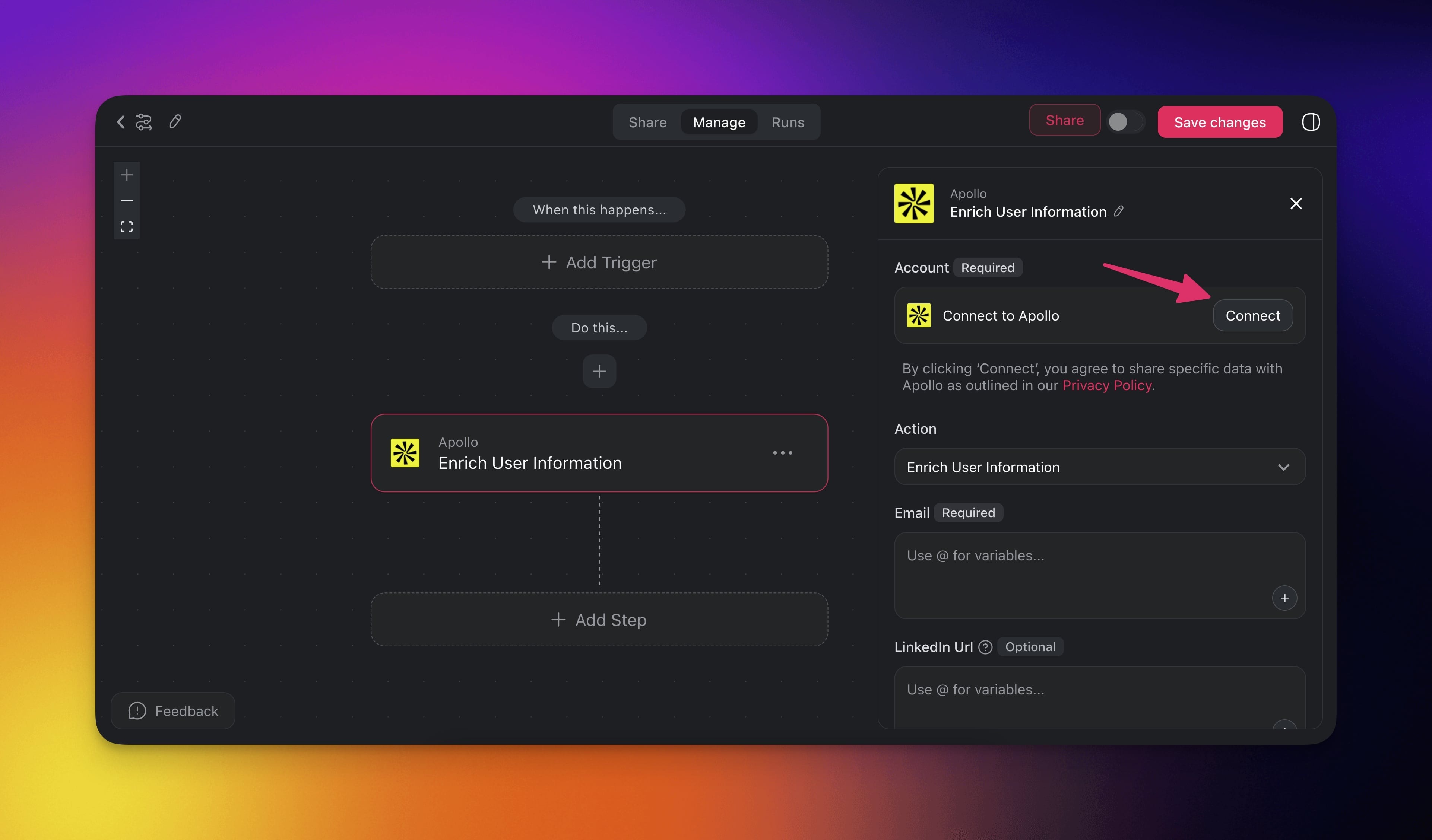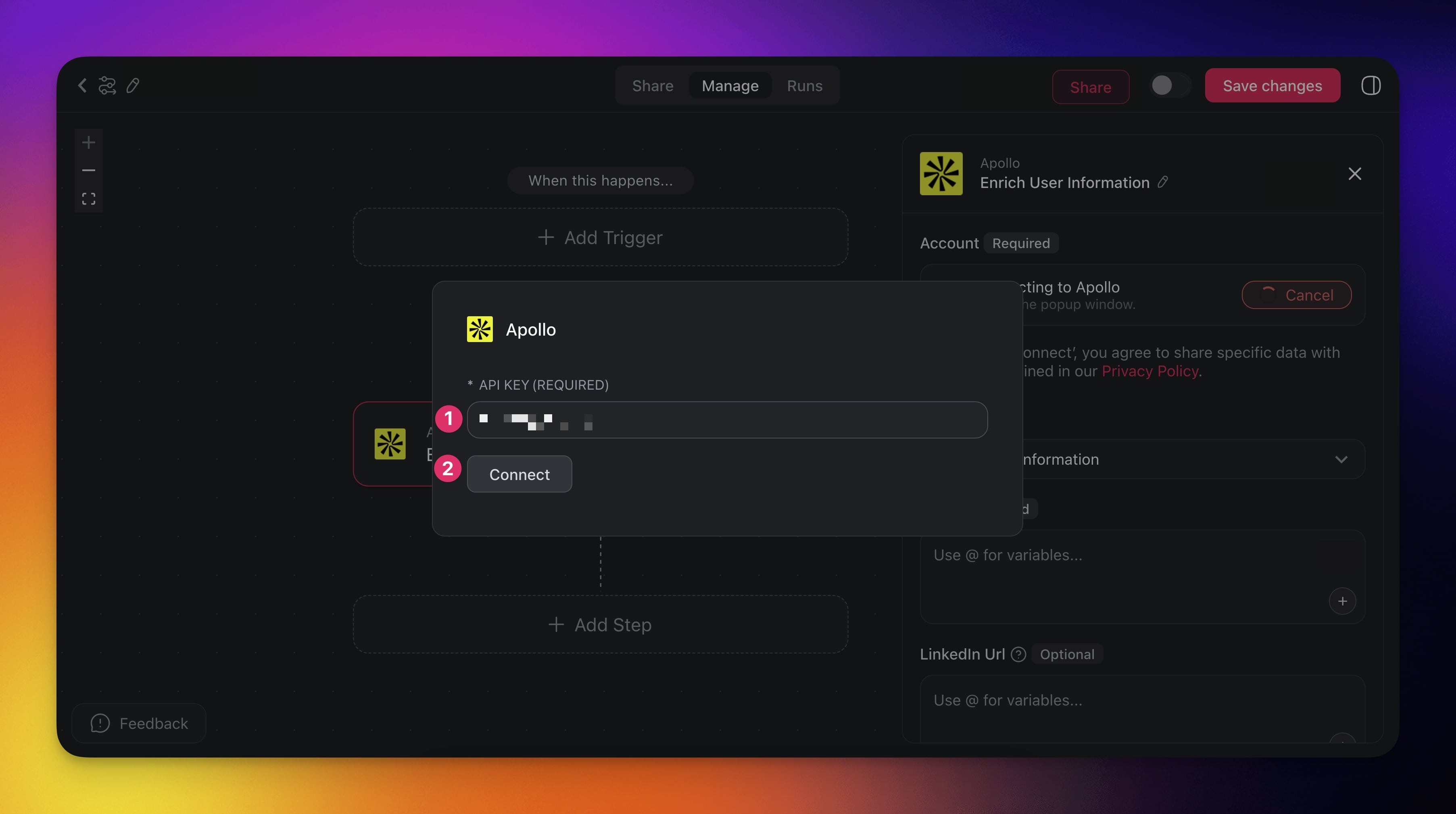 Use Apollo in your automation flows to dynamically retrieve detailed user information and enrich your CRM contacts with valuable insights.