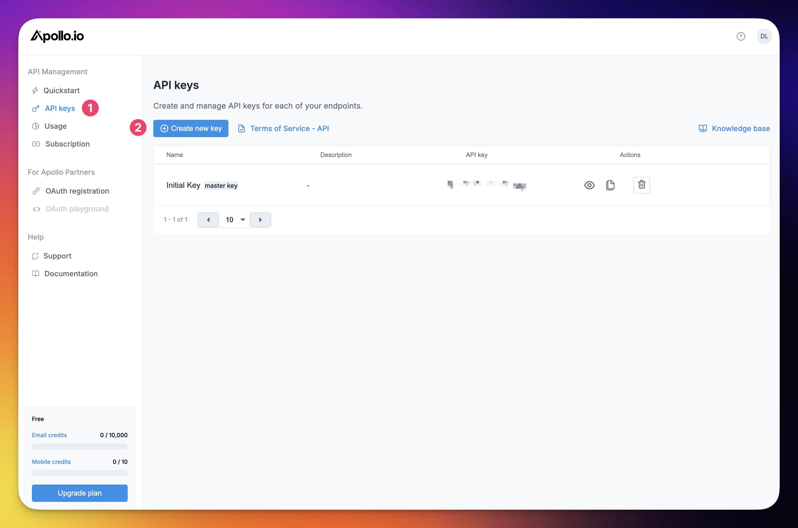 - Click API keys in the sidebar on the left (1) โก click Create new key (2).