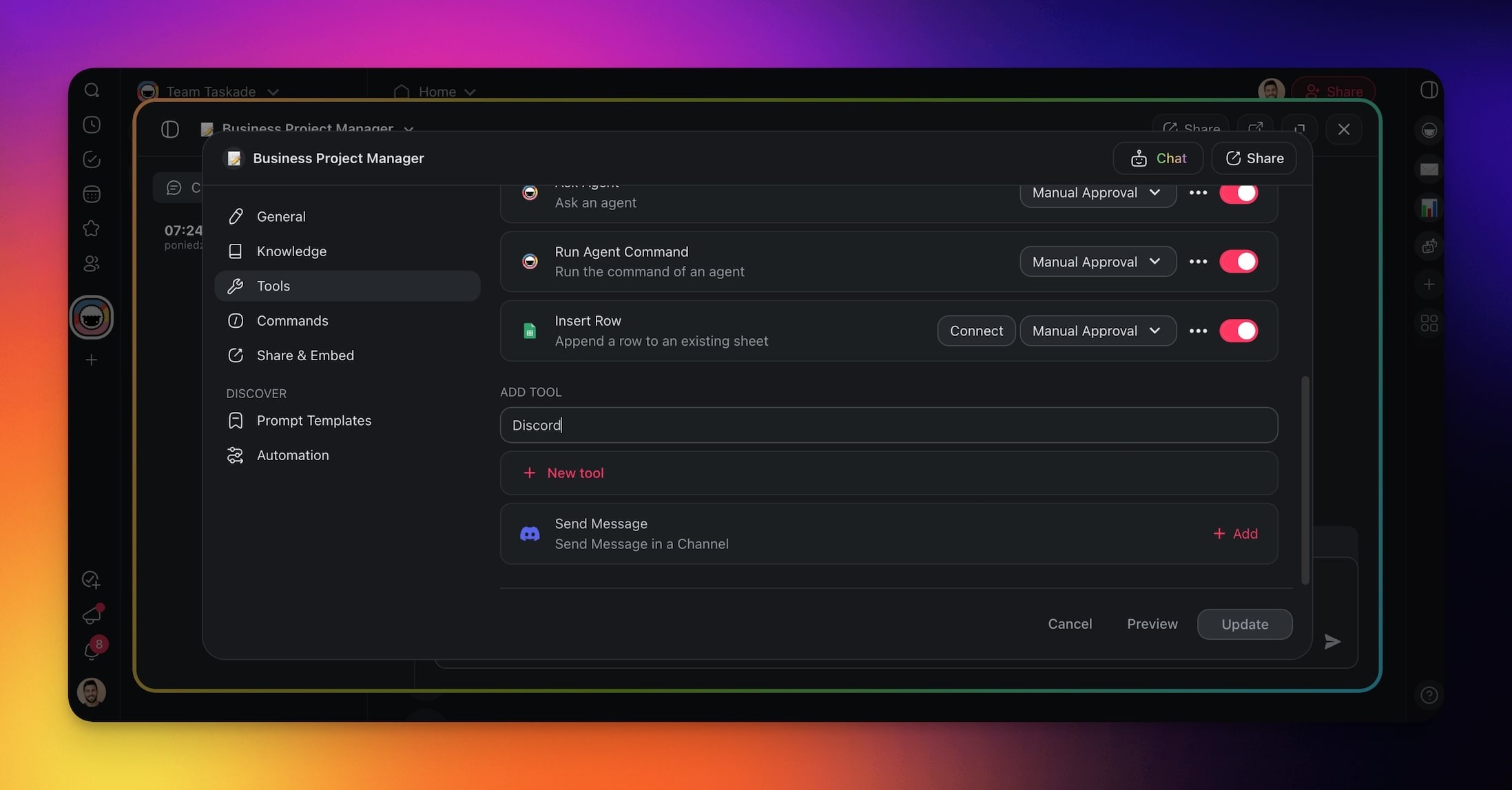 Connecting your Custom AI Agents with the Discord tool empowers them to send messages to selected Discord channels based on agent interactions.