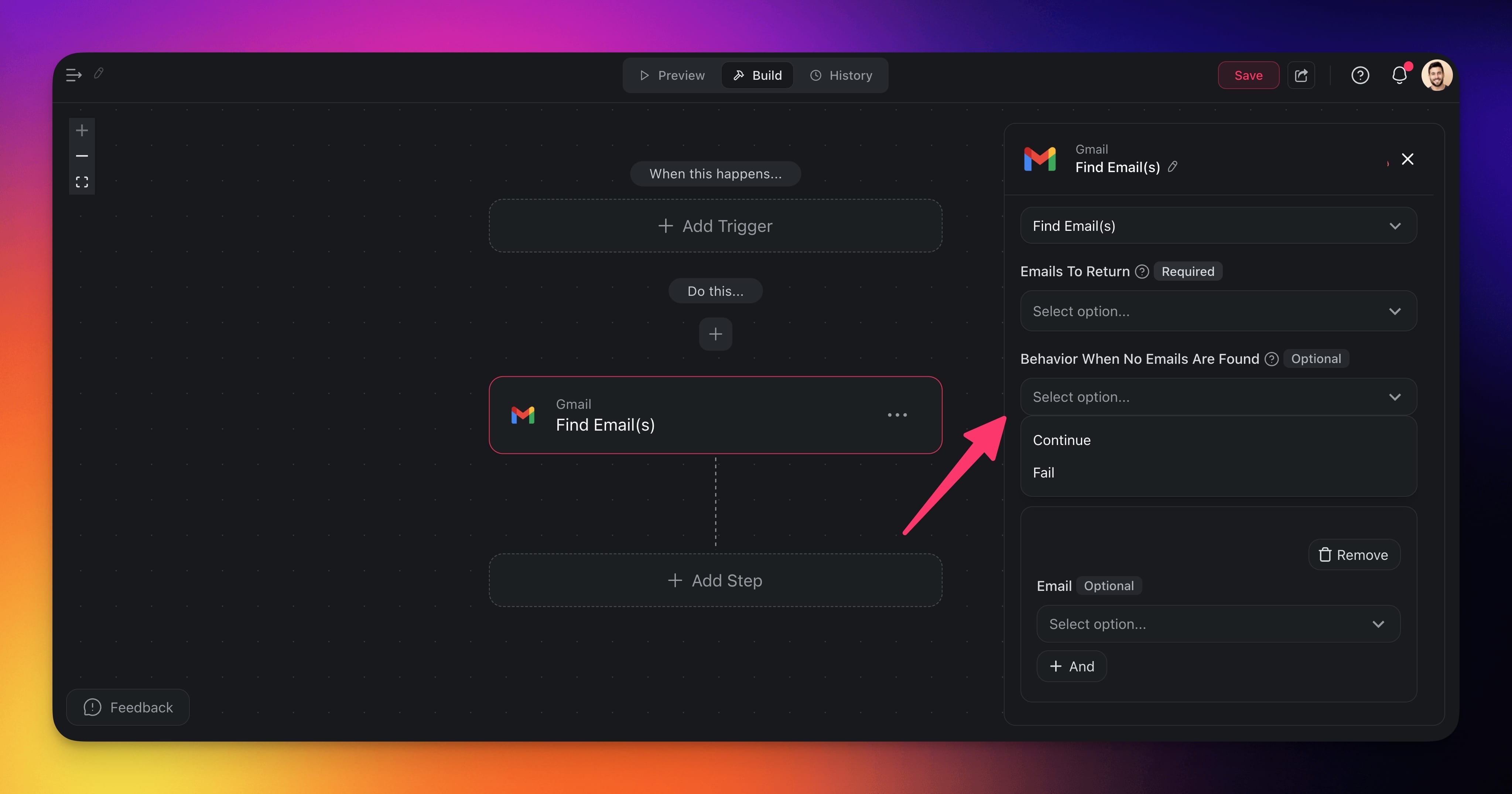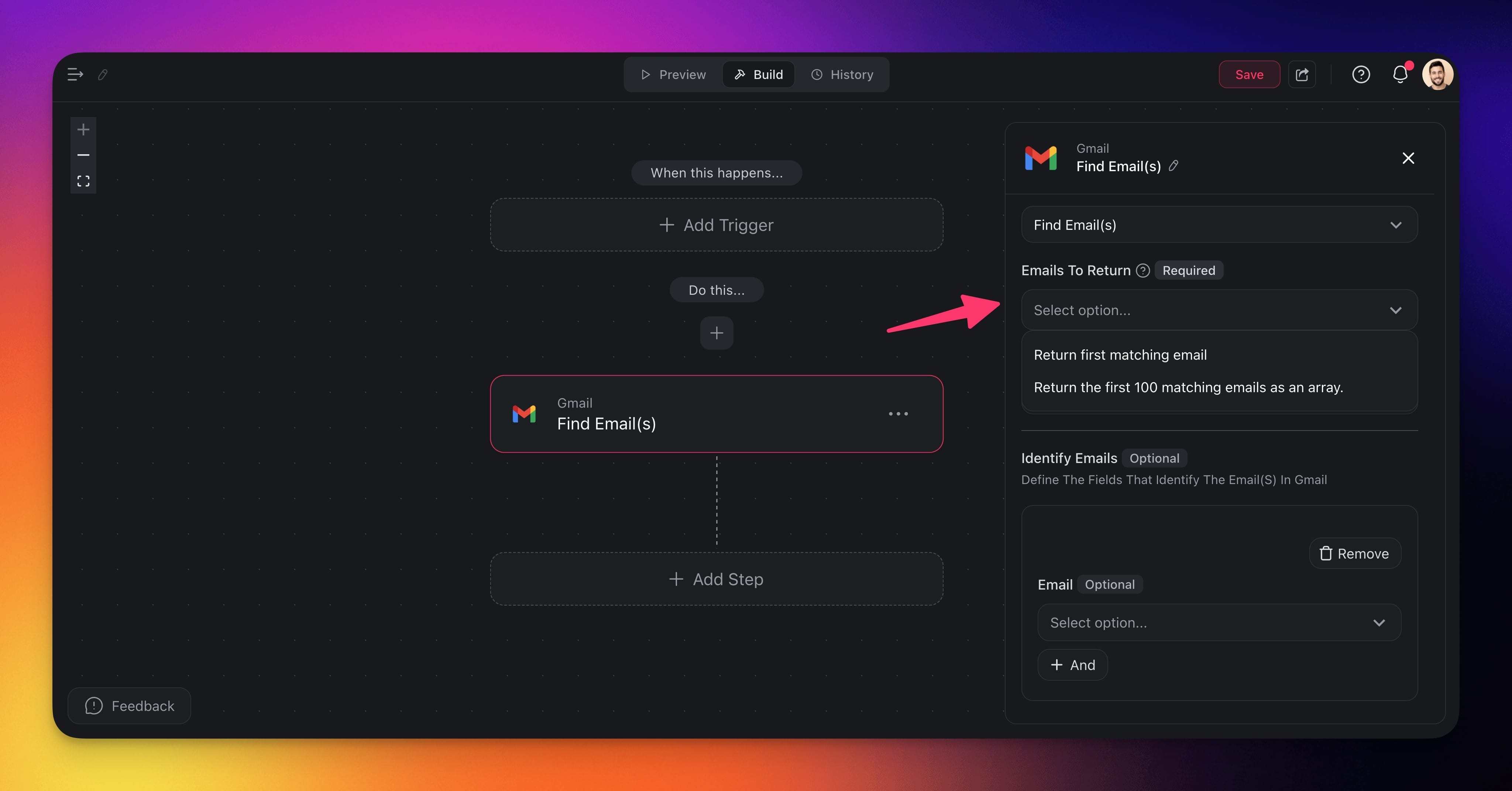 The Find Email(s) actions allows you to locate specific emails from your inbox.