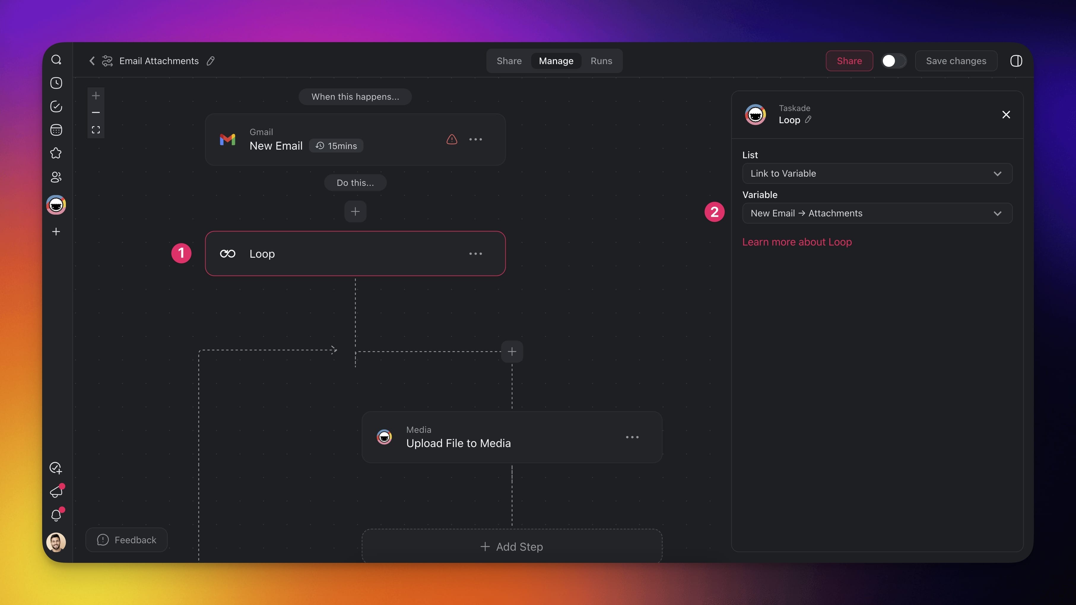 In this example, Taskade loops through attachments and adds them to the Media tab.