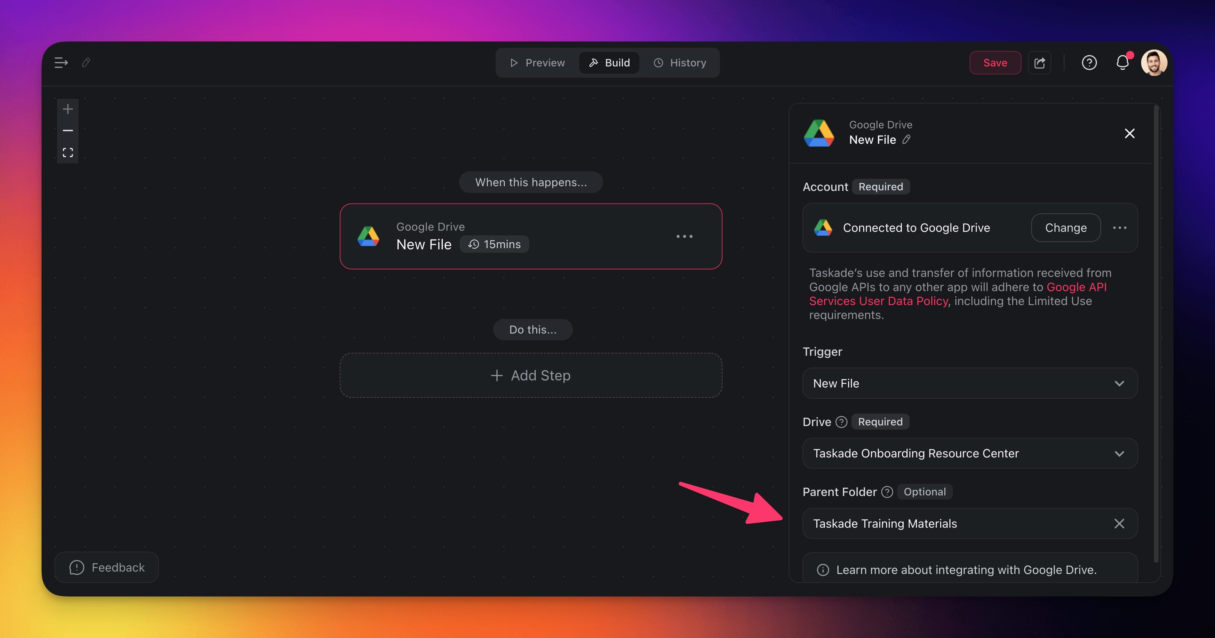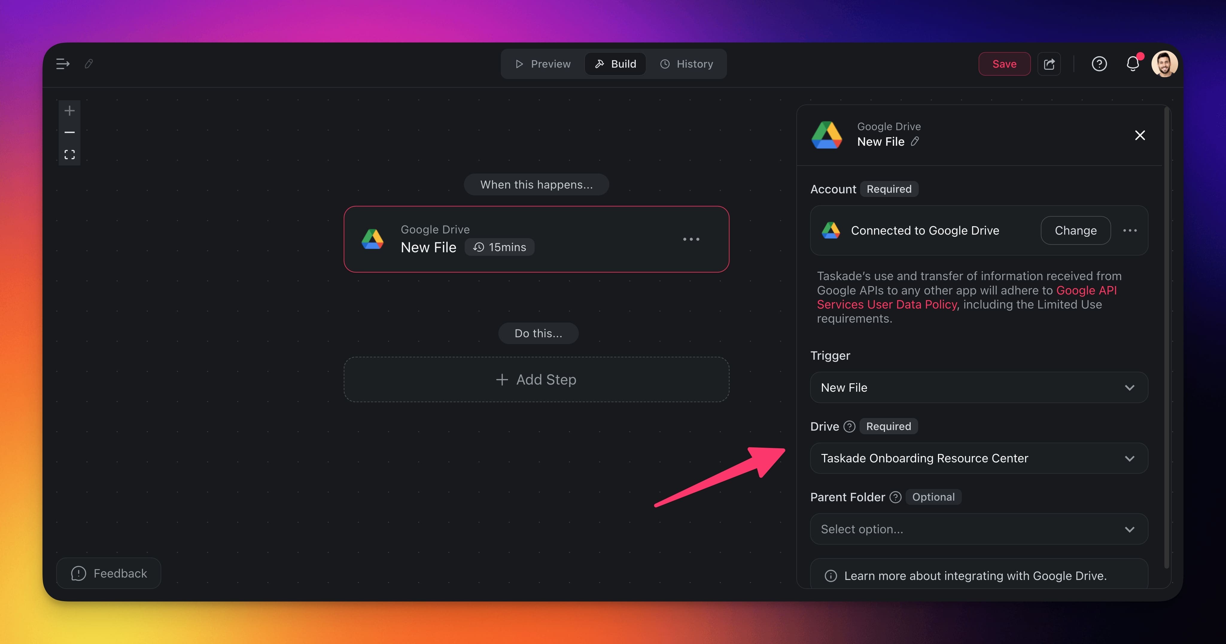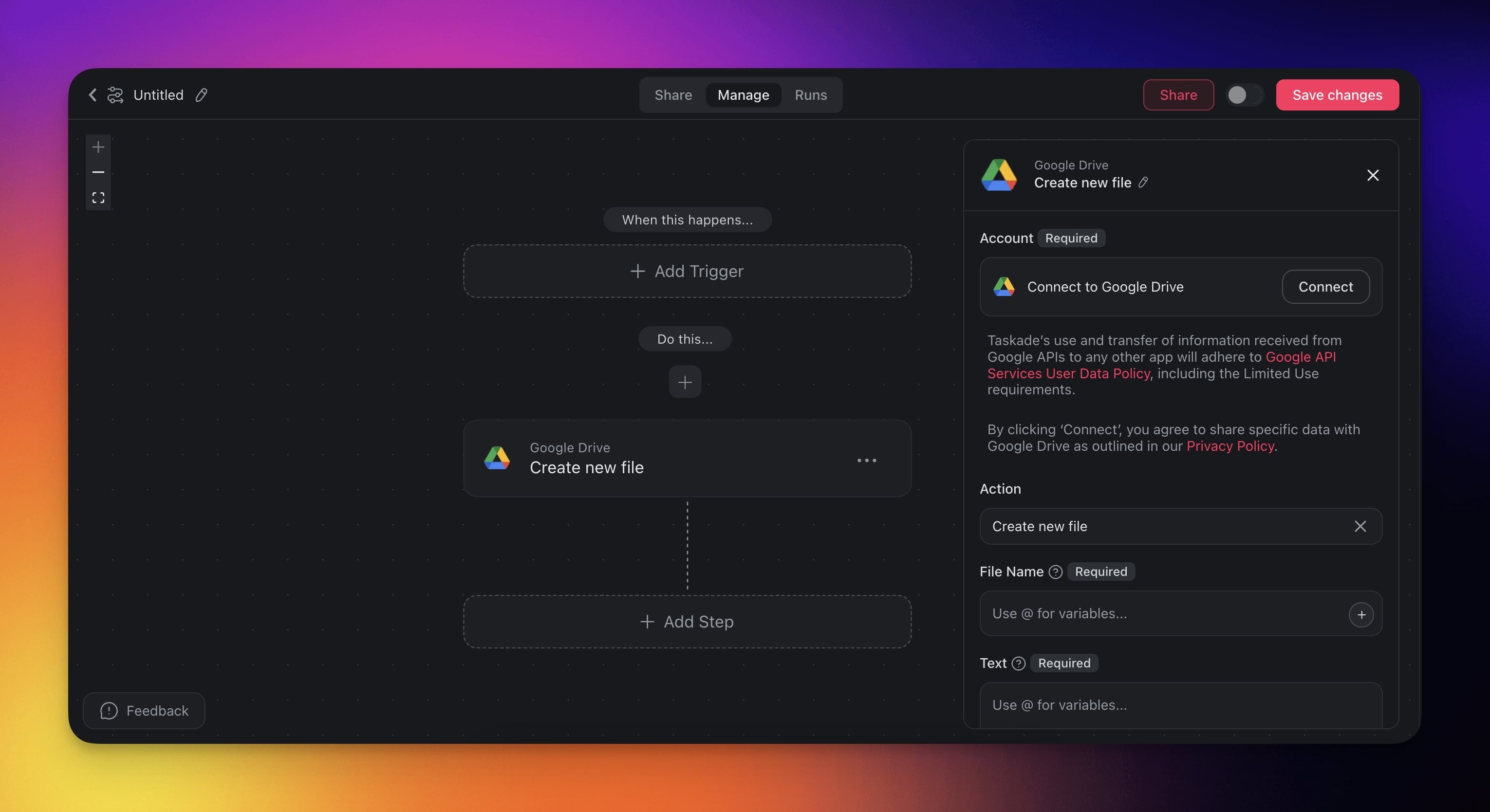 Set up Taskade to automatically sync and update your Google Drive files when specific triggers occur, such as project milestones or task completions.