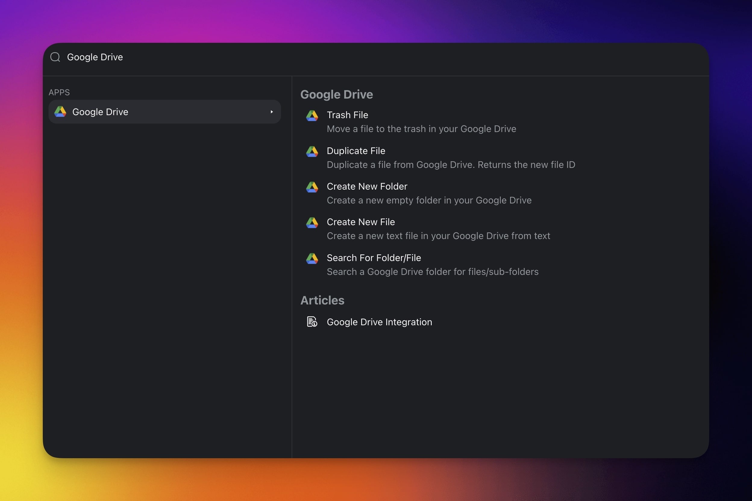 | Duplicate File | Duplicates a file from Google Drive. Returns the ID of the new file. |