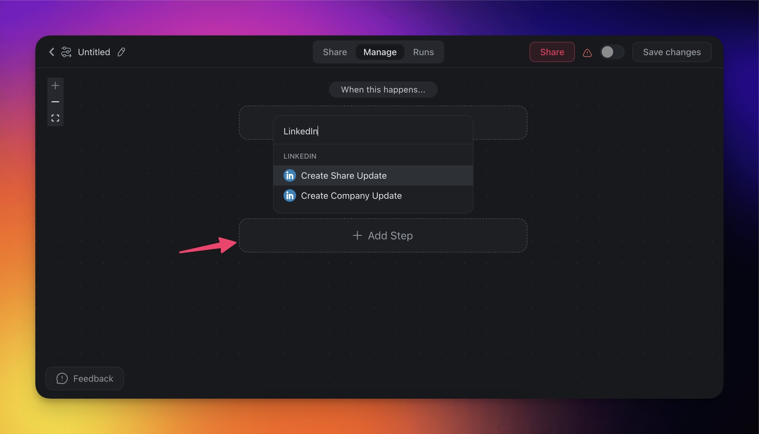 | Share industry insights | Automatically post insightful articles or reports relevant to your industry on LinkedIn to establish thought leadership and engage your network. |