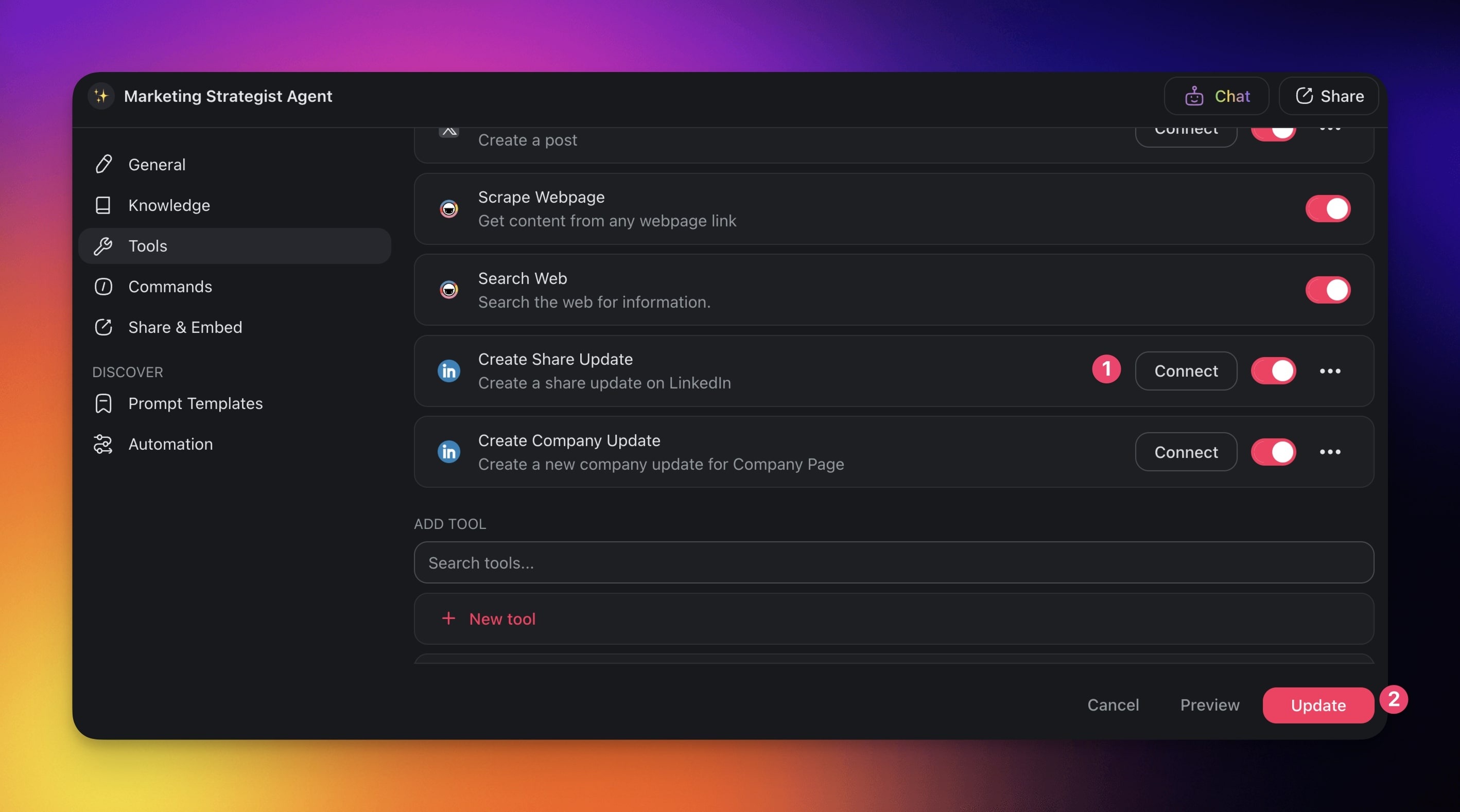 - Click โ Add tool and choose a LinkedIn tool from the list.