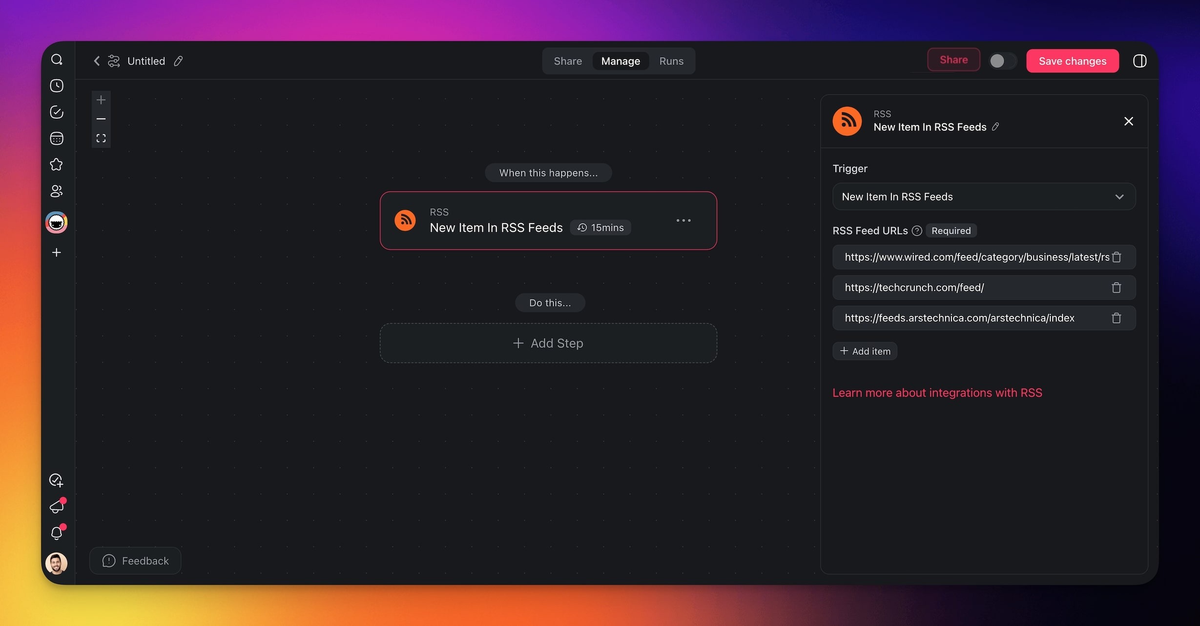 | Kick off projects | Initiate a new project in your task management system based on a predefined template whenever significant content is published to RSS feeds. This is particularly useful for content marketing or promotional campaigns. |