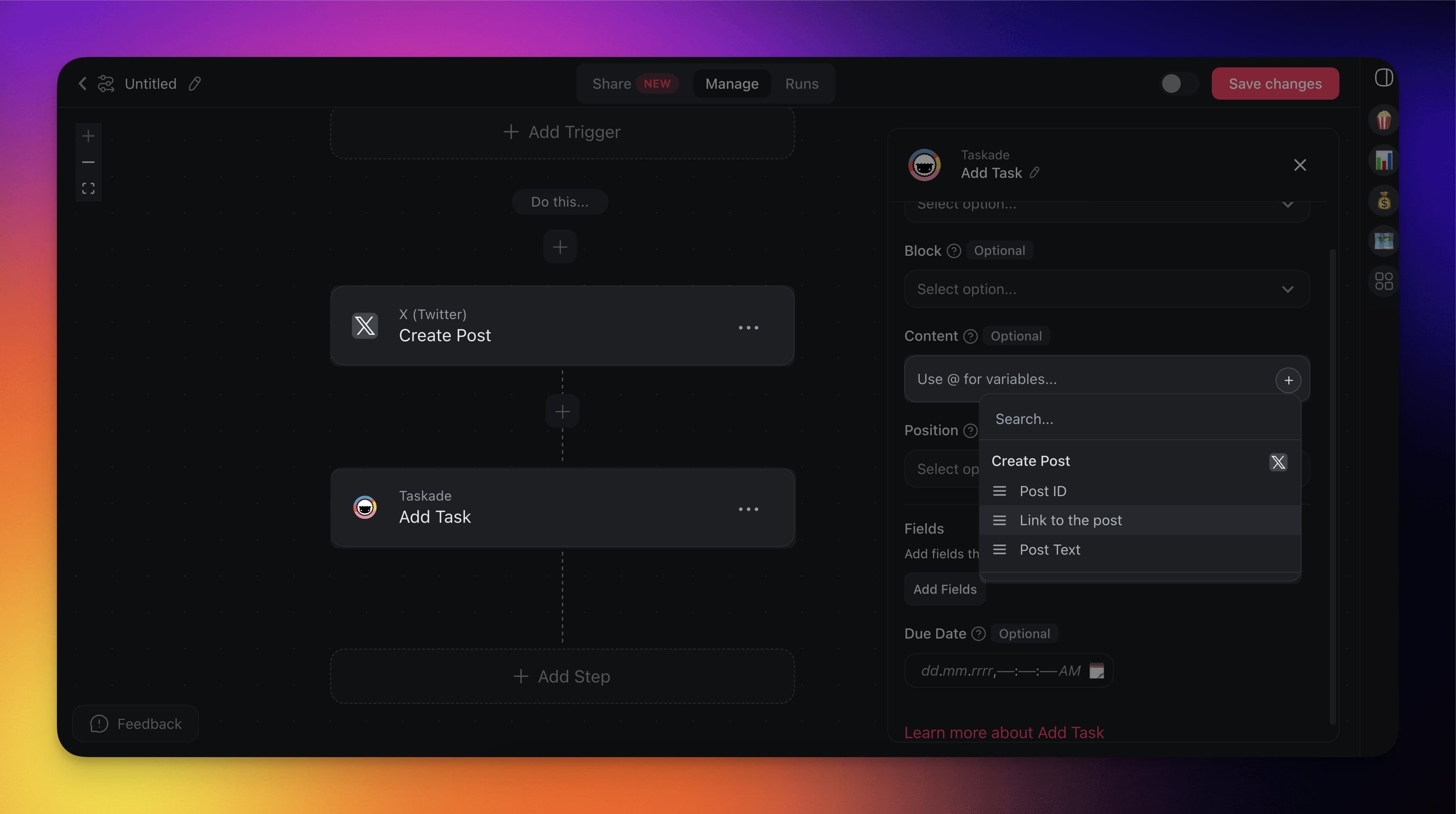 Configure Taskade to automatically create posts and replies on X/Twitter when specific triggers occur, such as project updates or task deadlines.