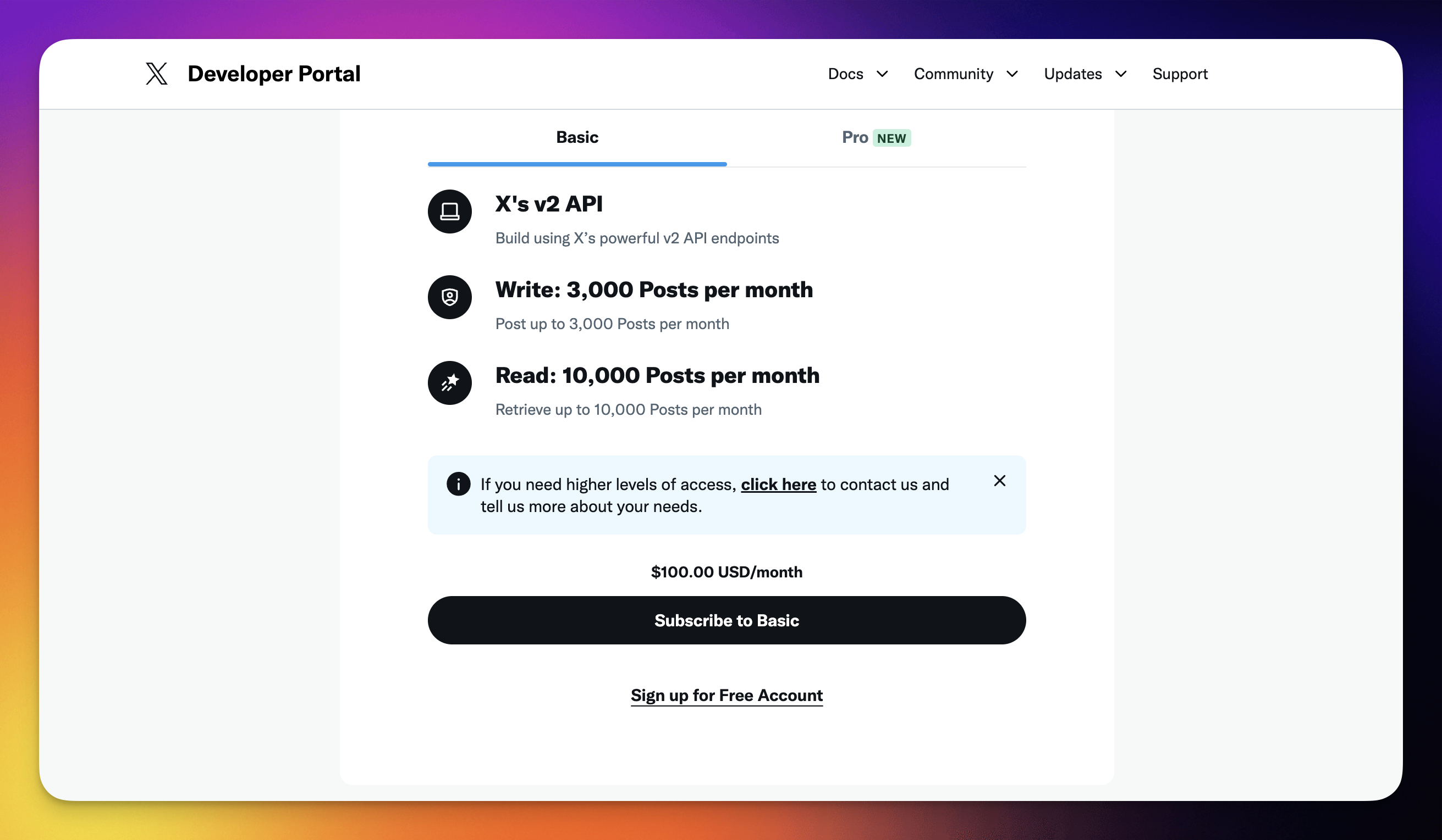 - (method 2): Click Sign up for Free Account to get access to the X API.