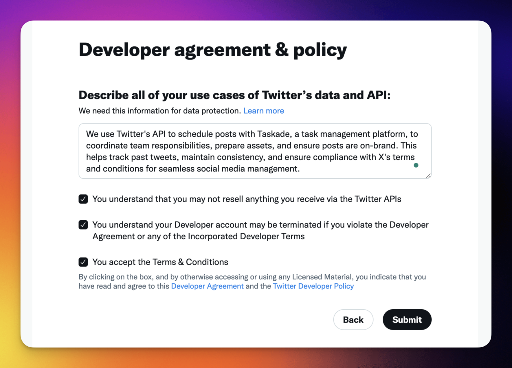 (example): "We use Twitter's API to schedule posts with Taskade, a task management platform, to coordinate team responsibilities, prepare assets, and ensure posts are on-brand. This helps track past tweets, maintain consistency, and ensure compliance with X's terms and conditions for seamless social media management."