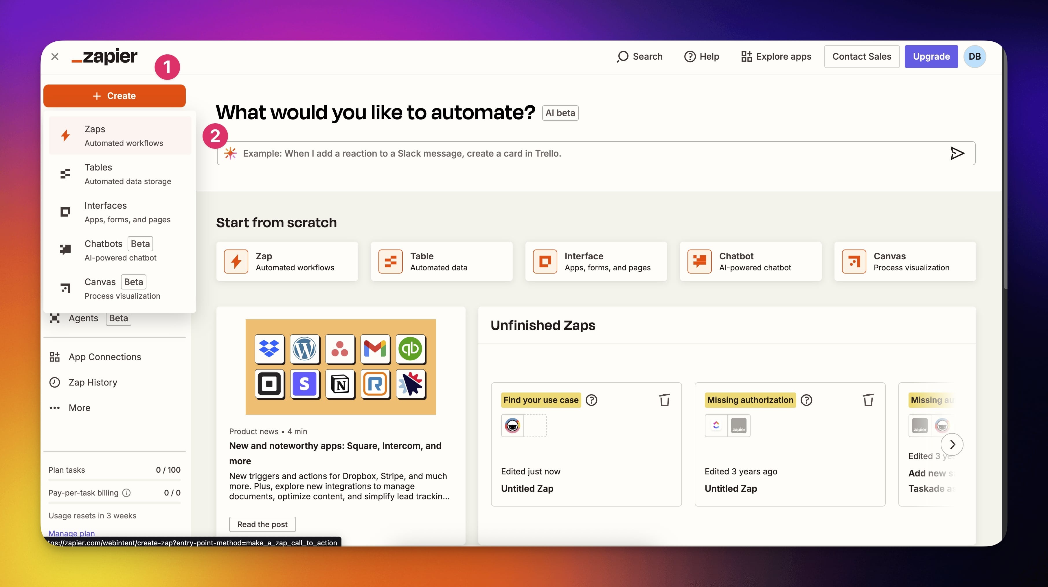 - In Zapier Dashboard, click the โ Create button (1) on the left โ Zaps (2).