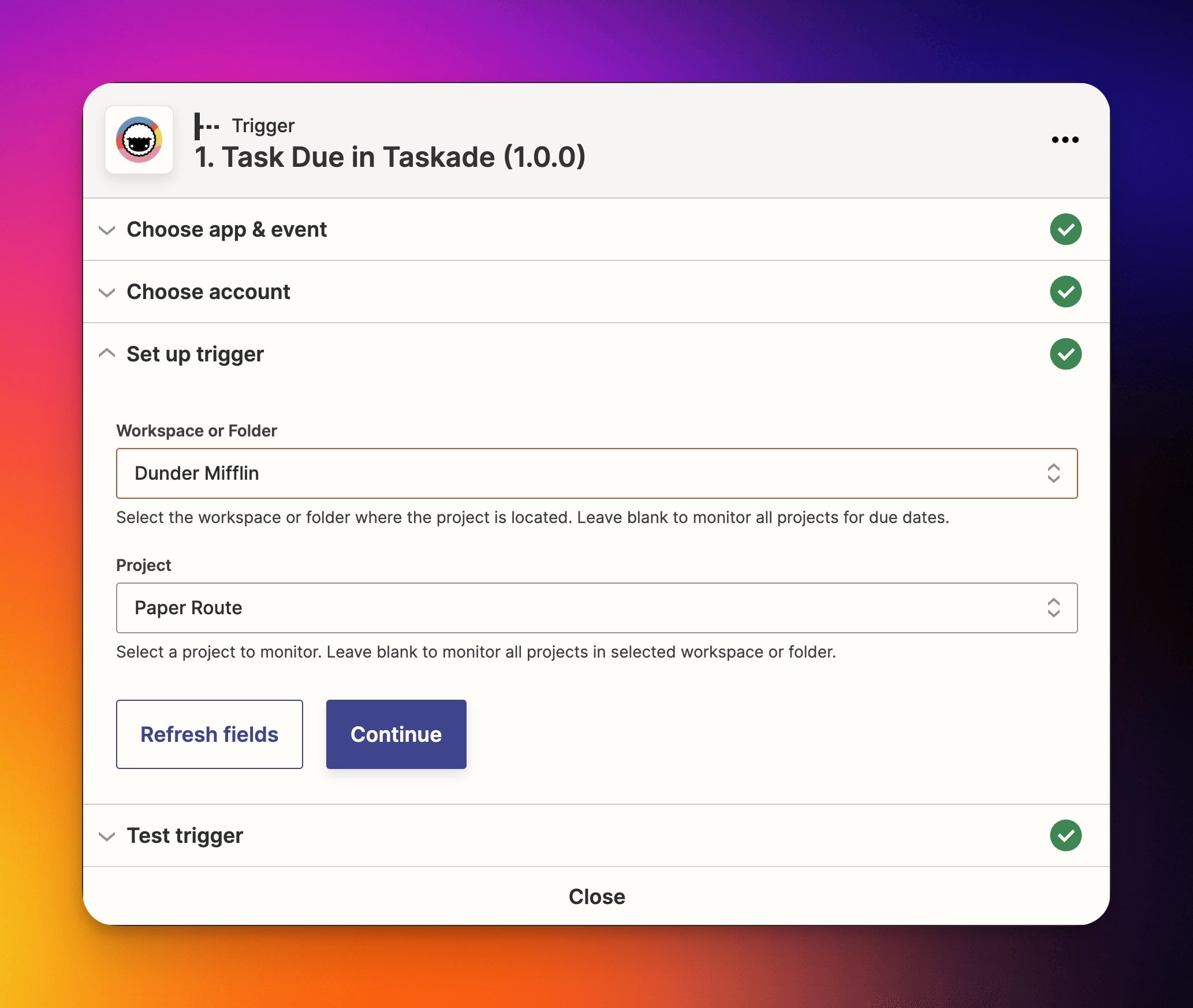 ๐ก Note: Depending on your Zapier plan, actions may take up to 15 minutes to appear in your Projects. The task due trigger, however, synchronizes instantly.