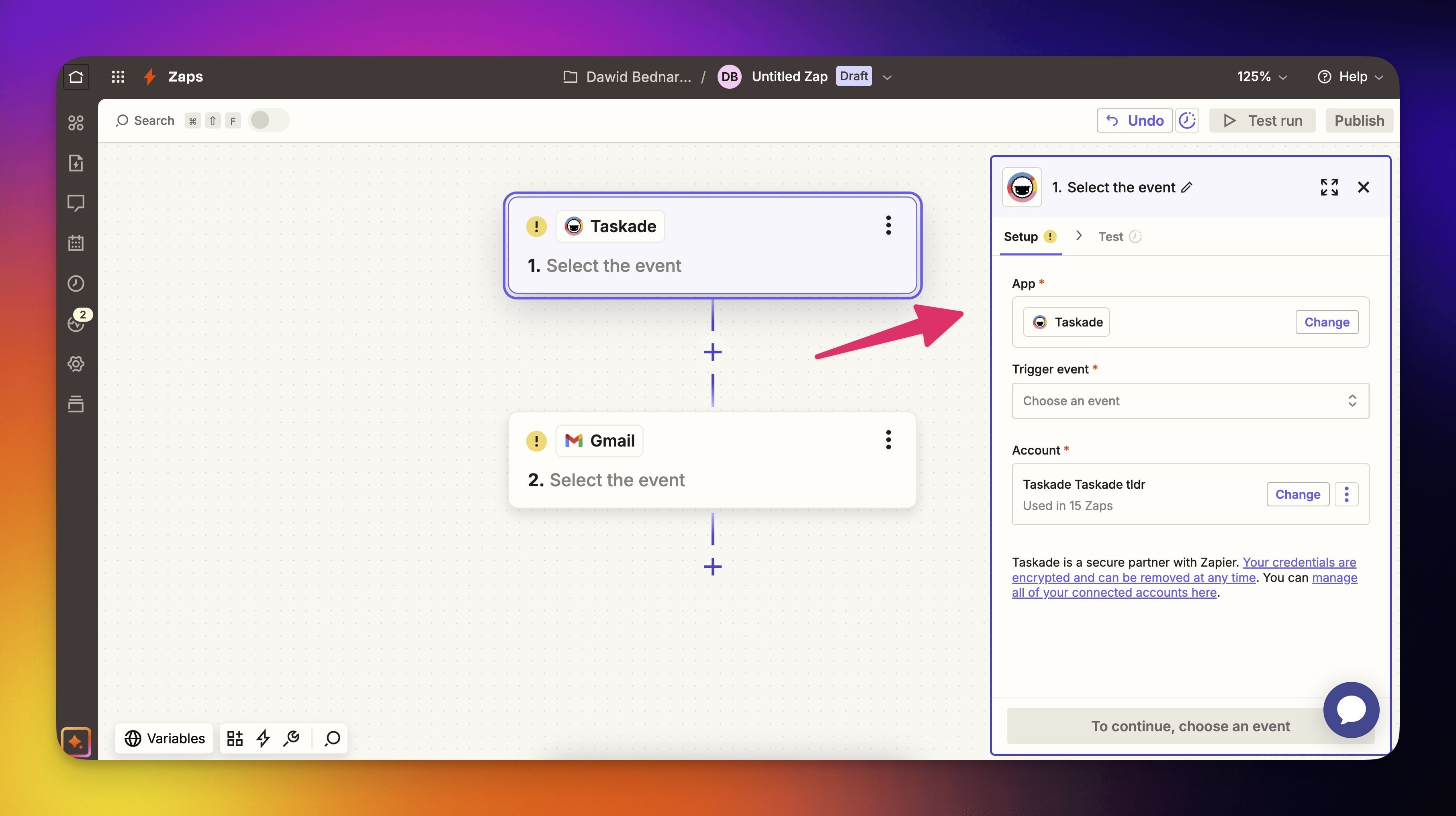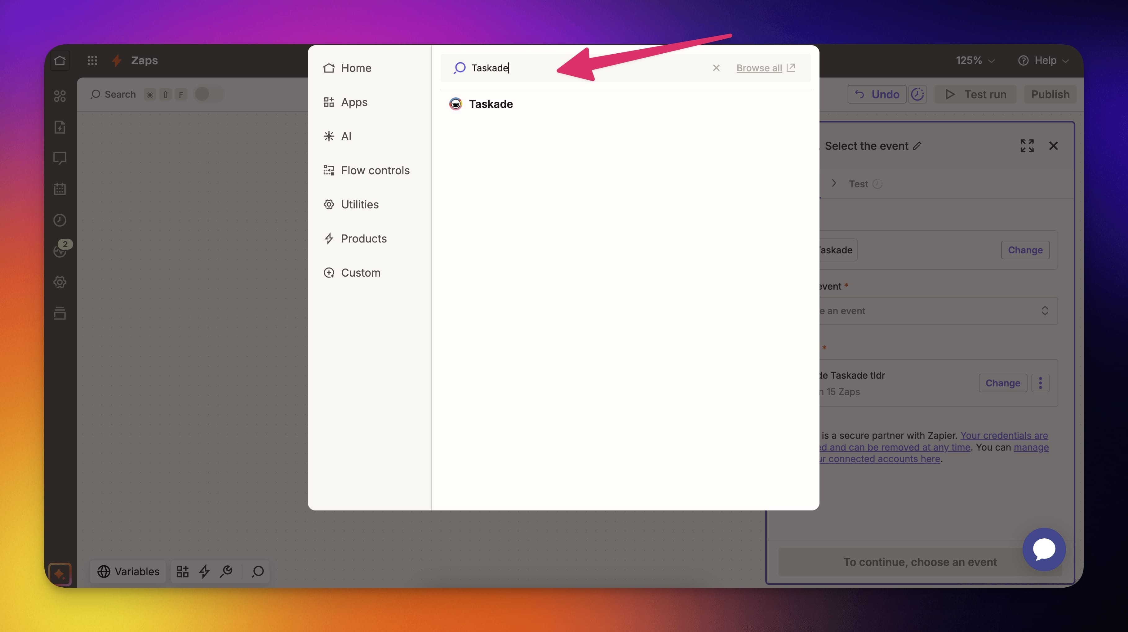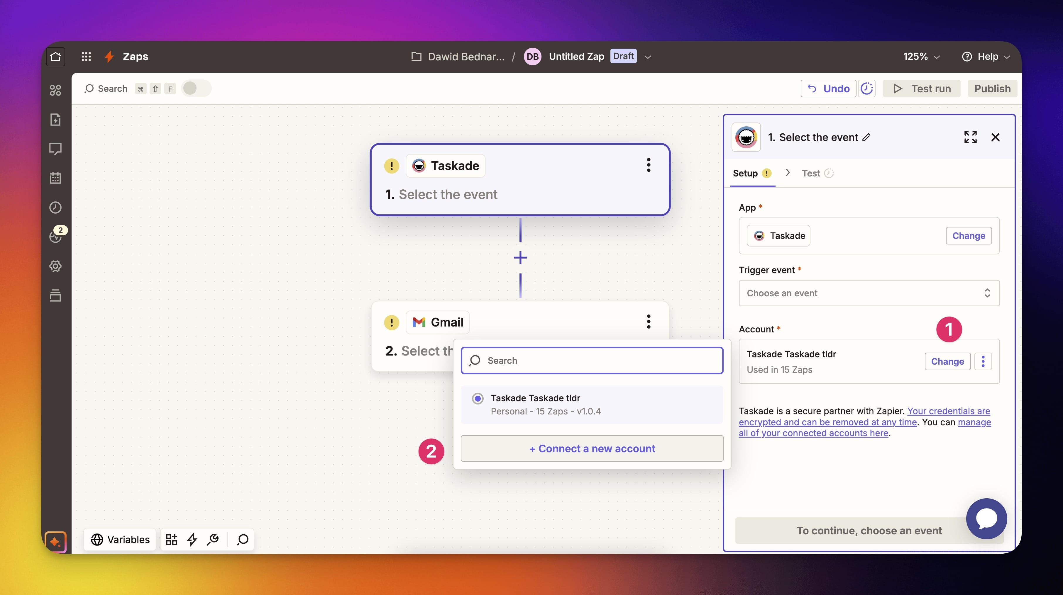 - Select Taskade as either a Trigger (1) or an Action(2)(see the next section).