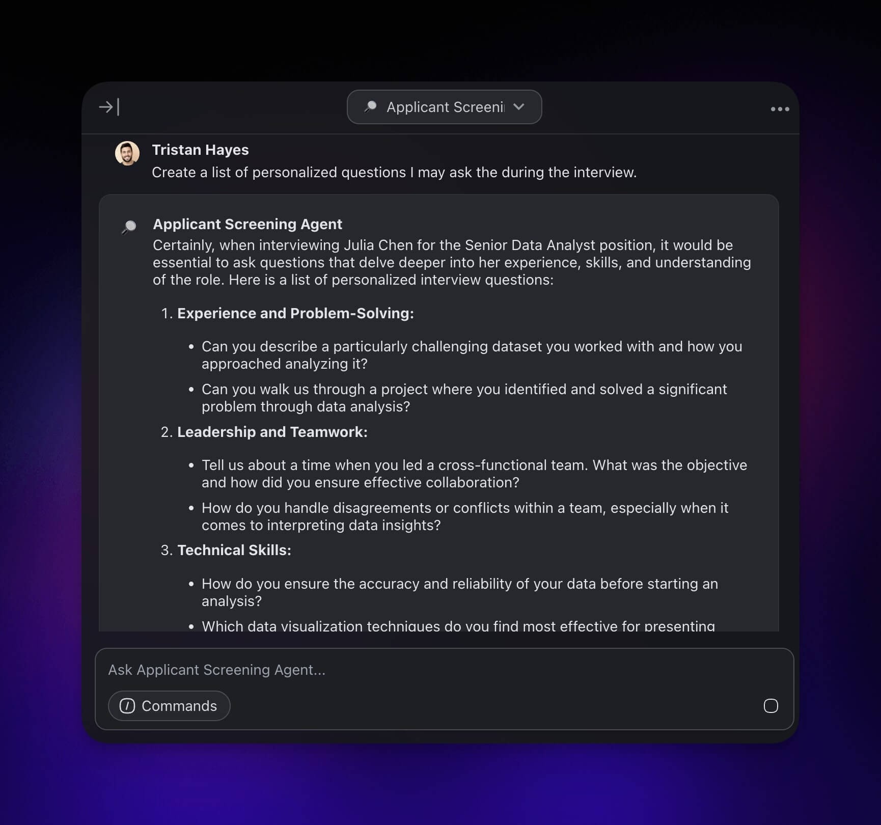 Finally, you may ask the agent to generate a list of personalized questions you'll ask the applicant during the interview.