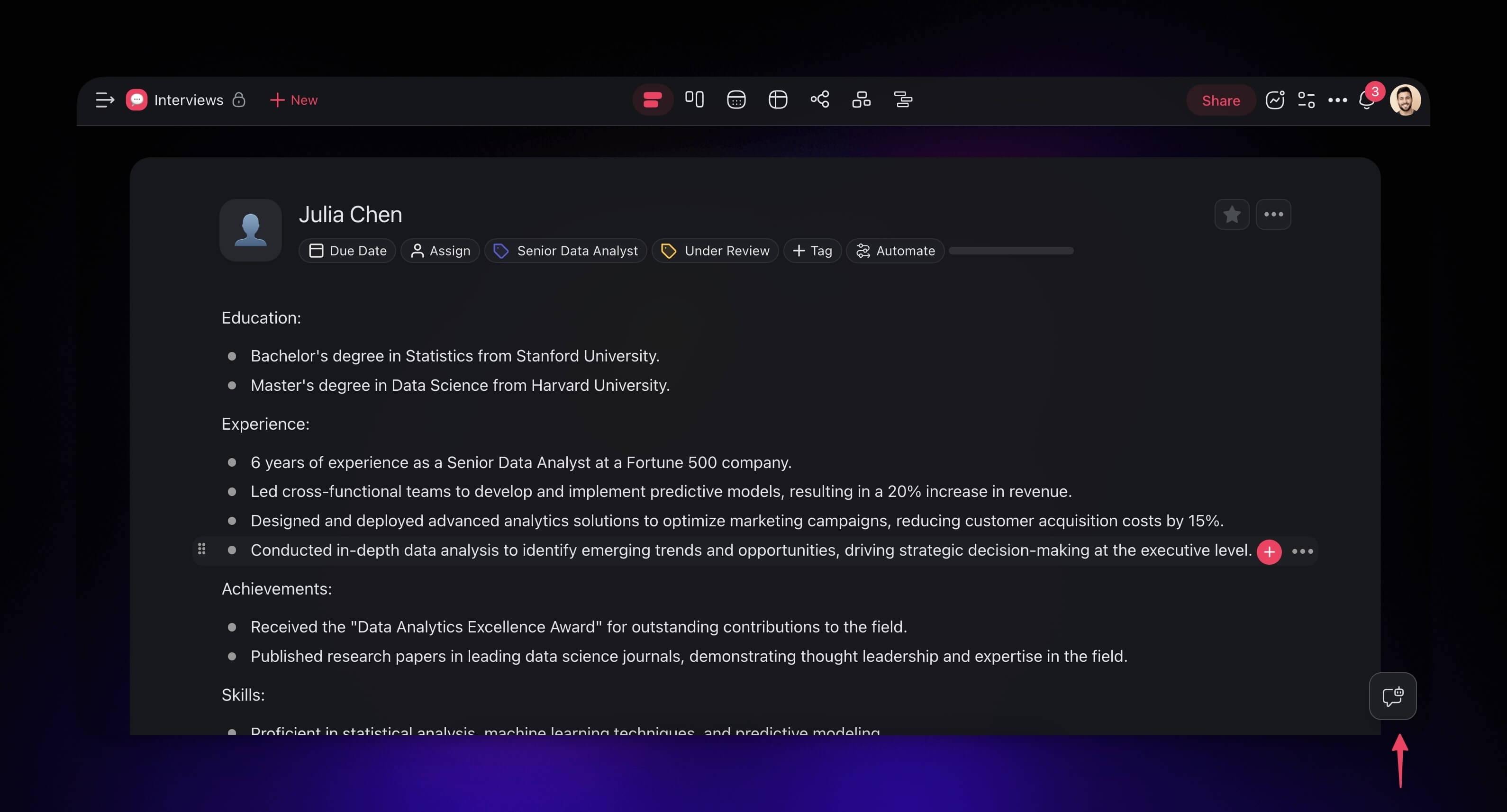 Each new project will correspond to individual candidates, which will allow us to assess their experience and see where they stand in the hiring pipeline.