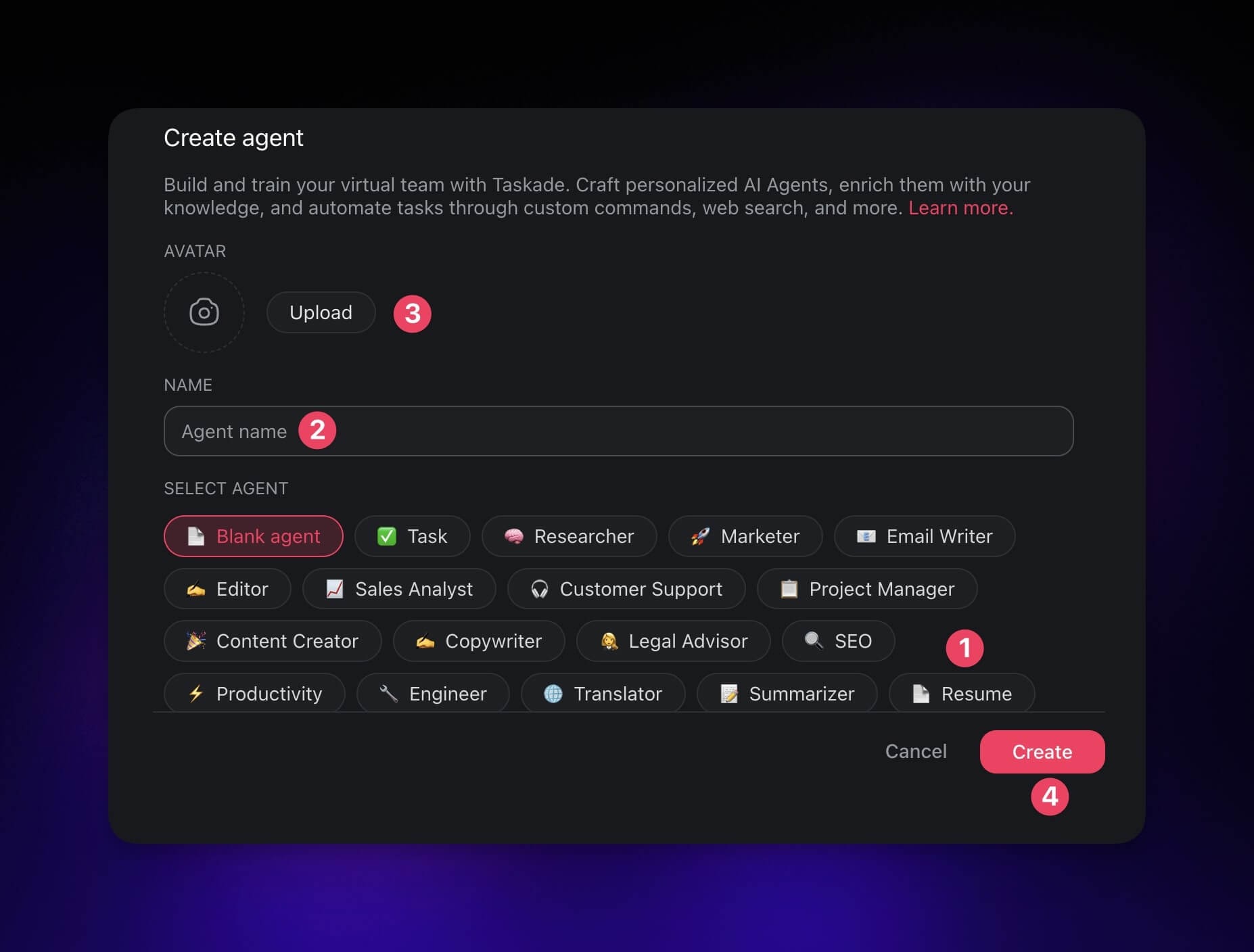 Creating a custom AI agent in Taskade is simple. You can set one up from scratch or use one of the existing agent templates to speed up the process.